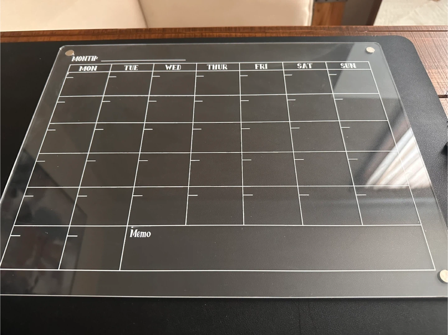 This is an acrylic dry erase calendar board. It's perfect for planning out your month and keeping track of important dates. There's also a section for memos!