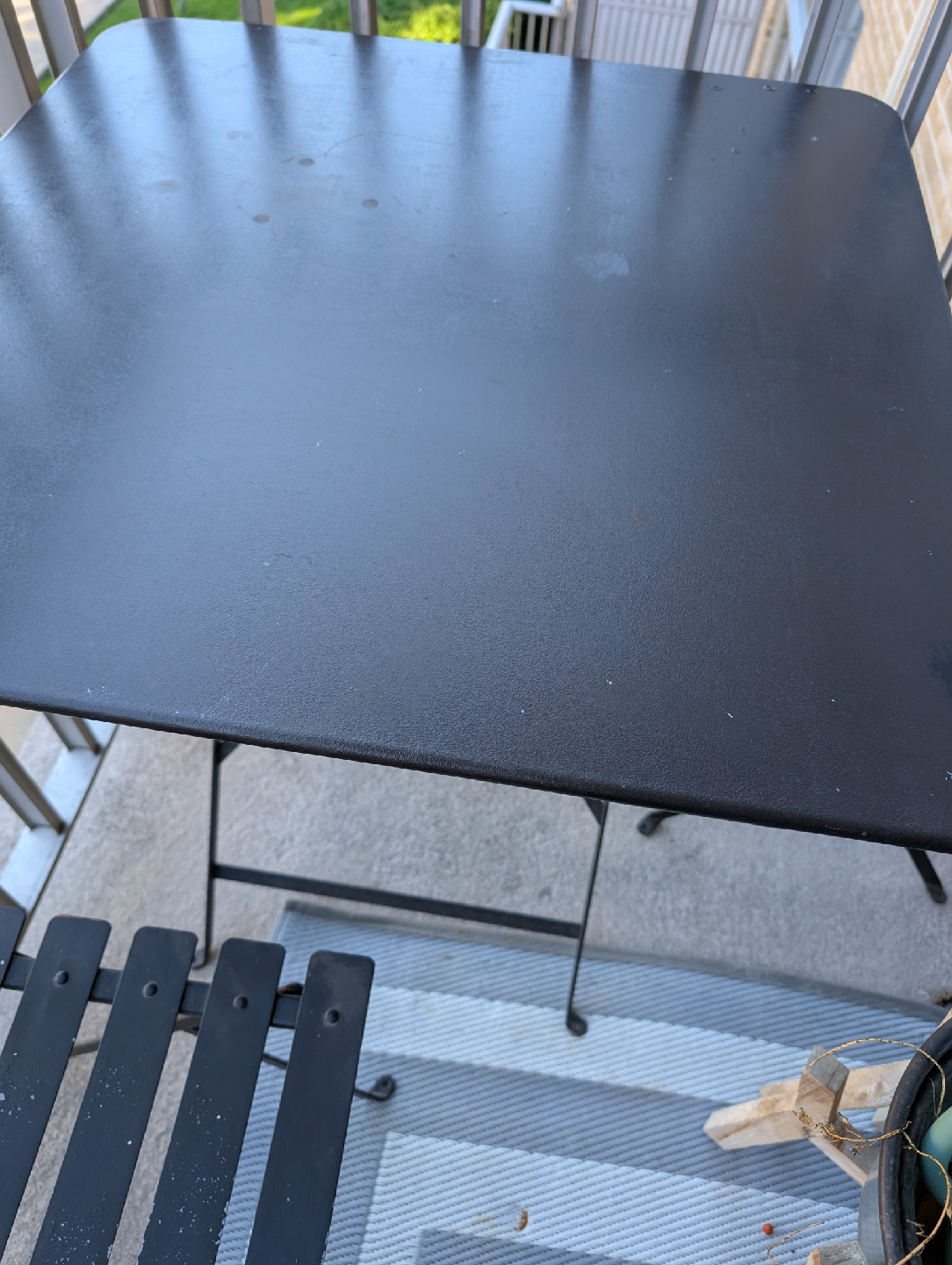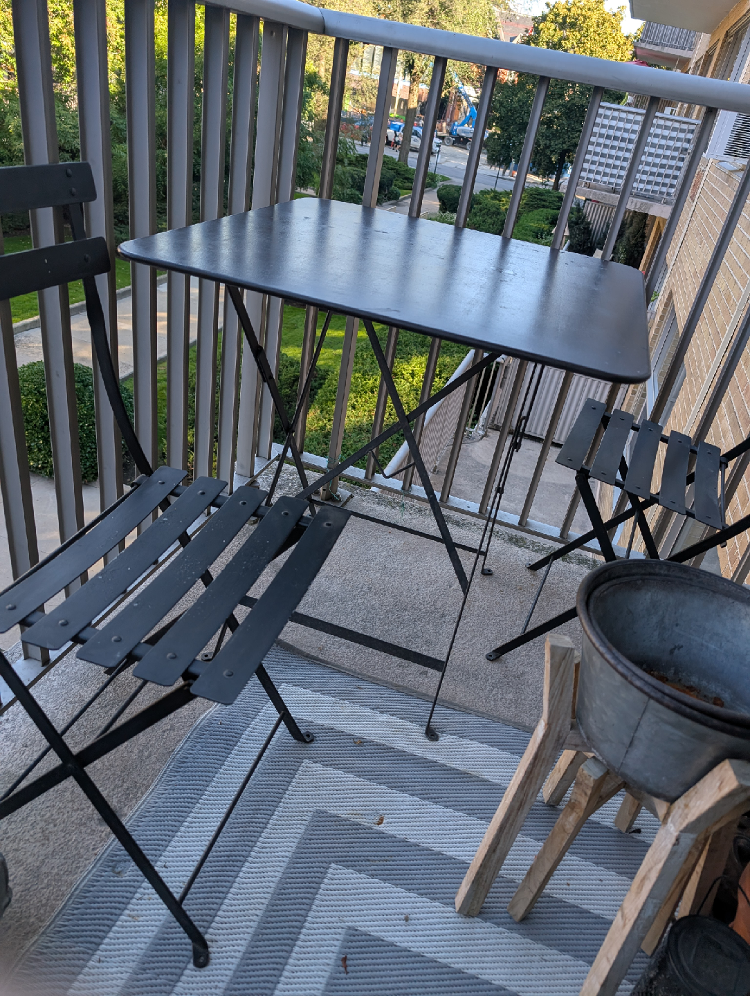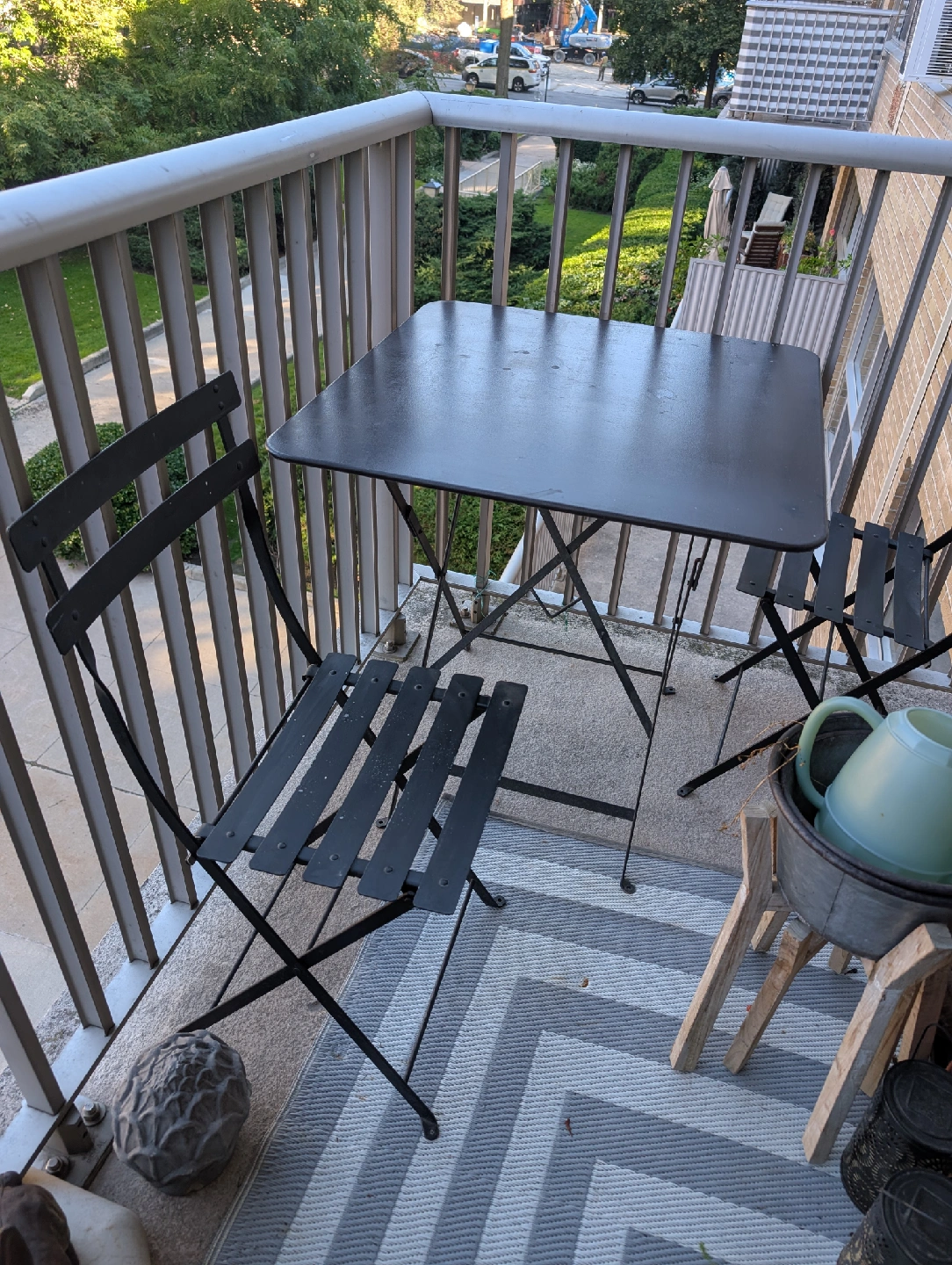 Selling a cute little black metal bistro set, perfect for a balcony or small patio! It includes a square table and two matching chairs.