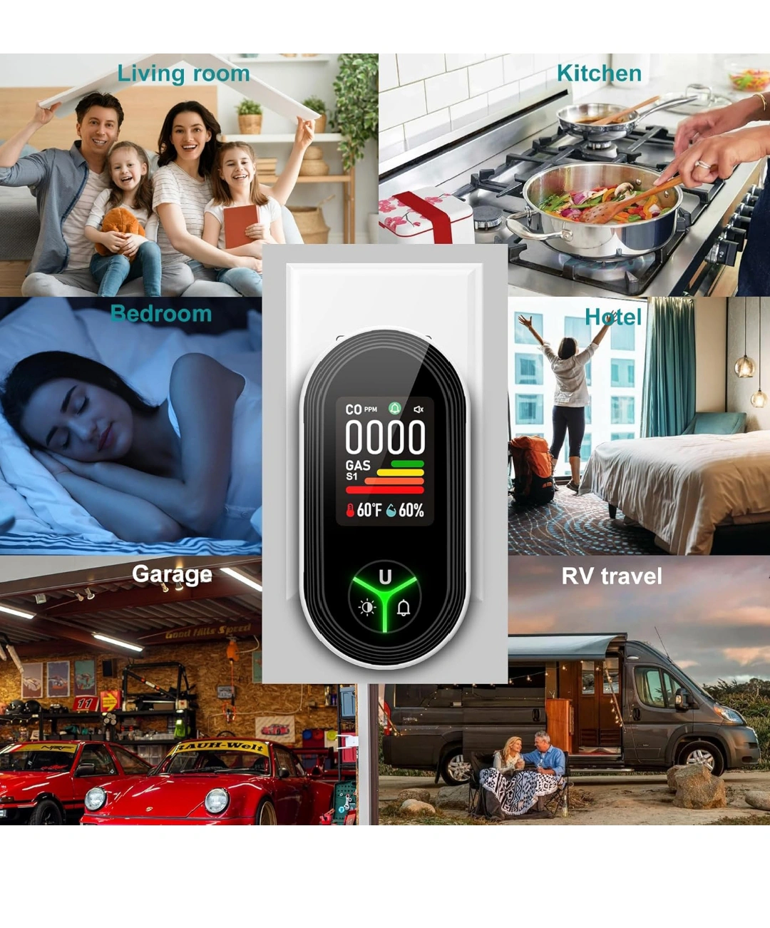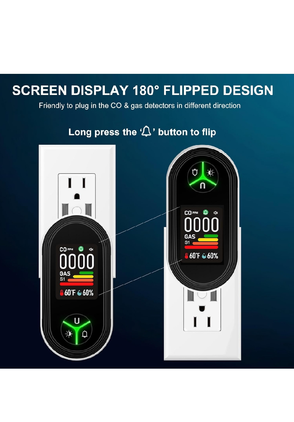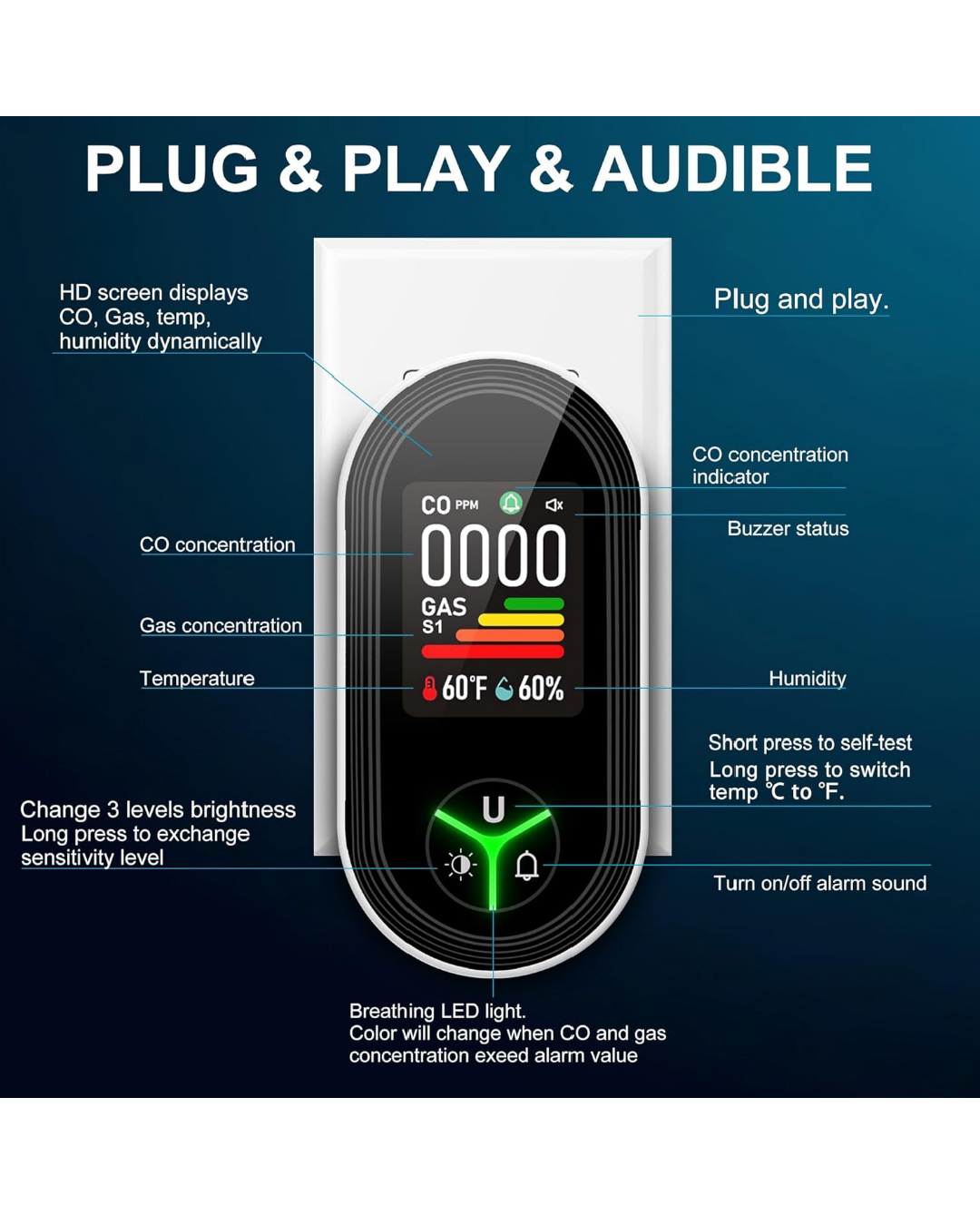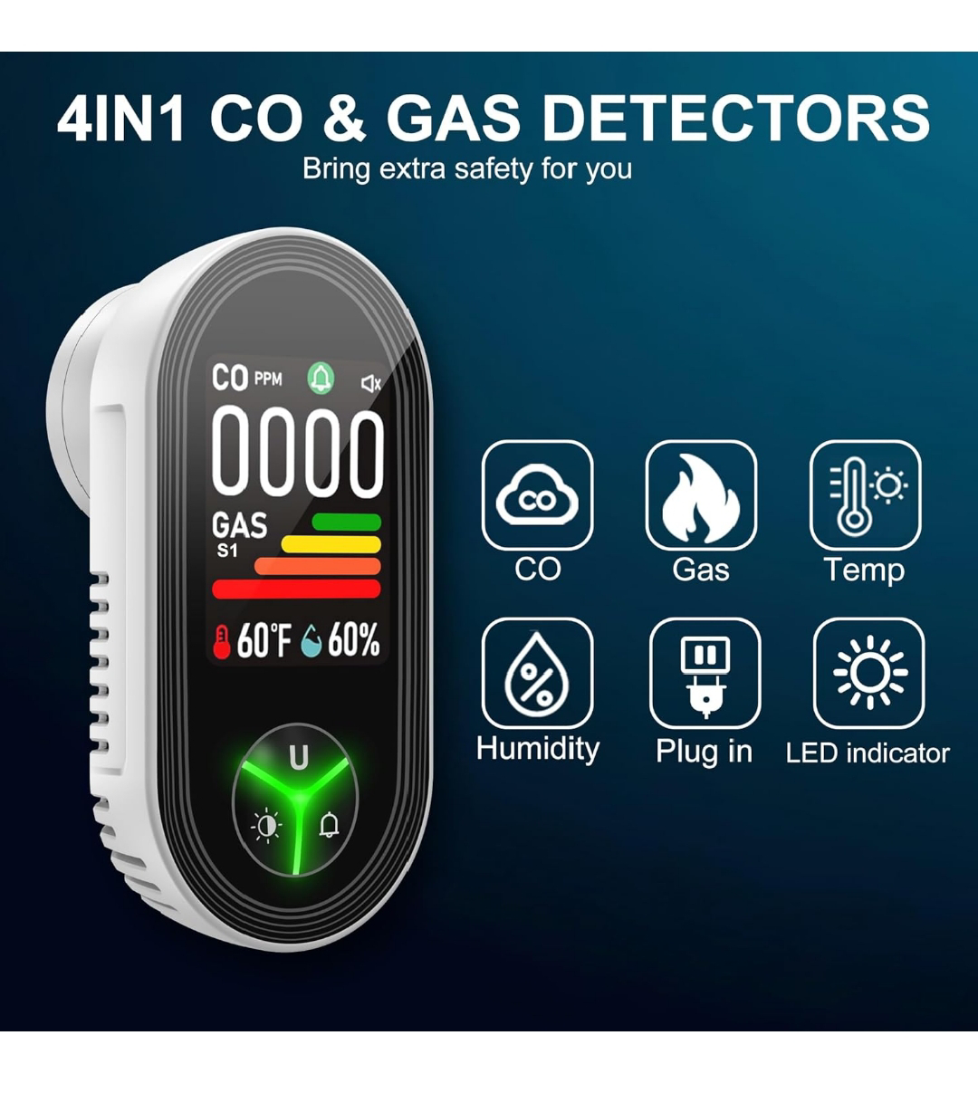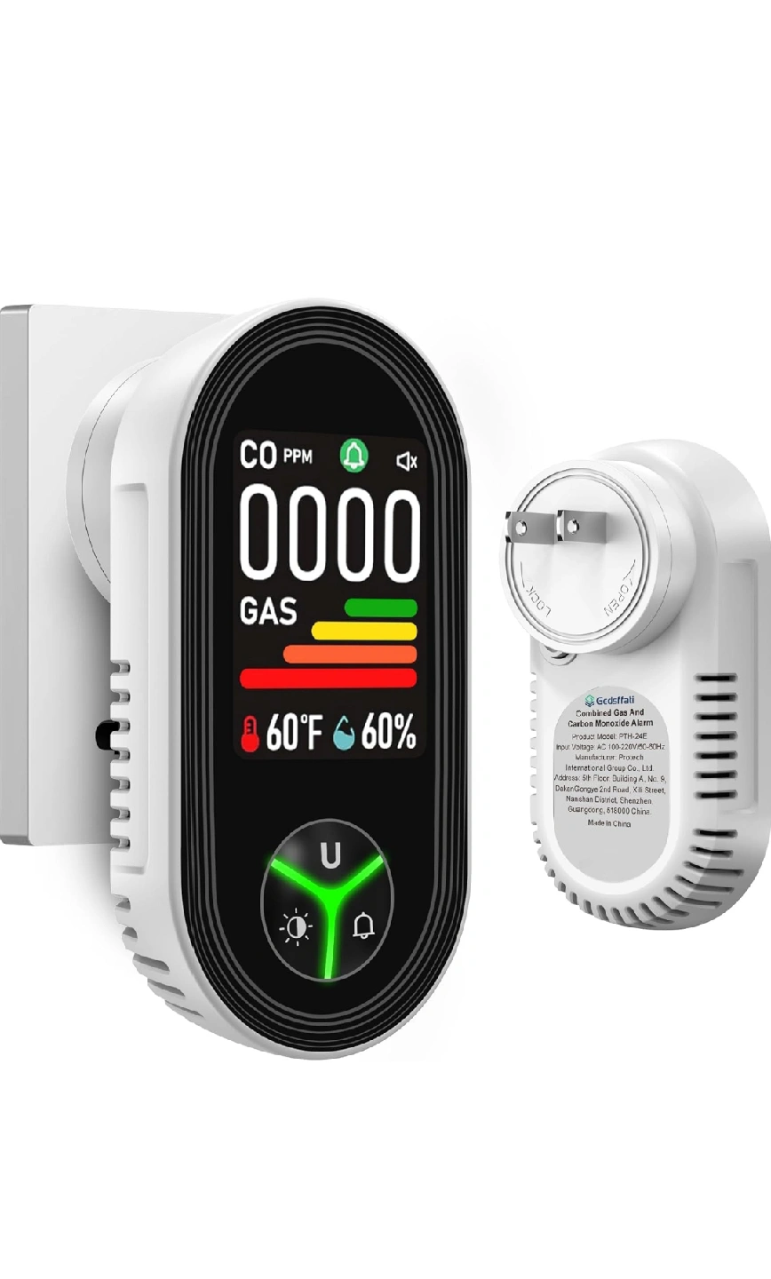 Gedsffati 4in1 Plug in 4-in-1 Natural Gas Alarm & Carbon Monoxide Detectors Combination Built-in Upgraded CO/Combustible Gas/Propane/Methane/Temp & Humidity Sensor for Home Room Kitchen Hotel RV.