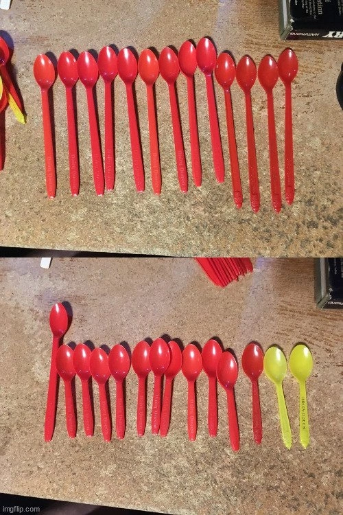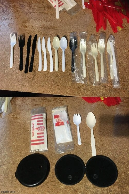 THERE ARE 31 SPOONS 3 SPORKS 6 FORKS 6 KNIVES 2 PLASTIC LIDS. cash only pick up at house