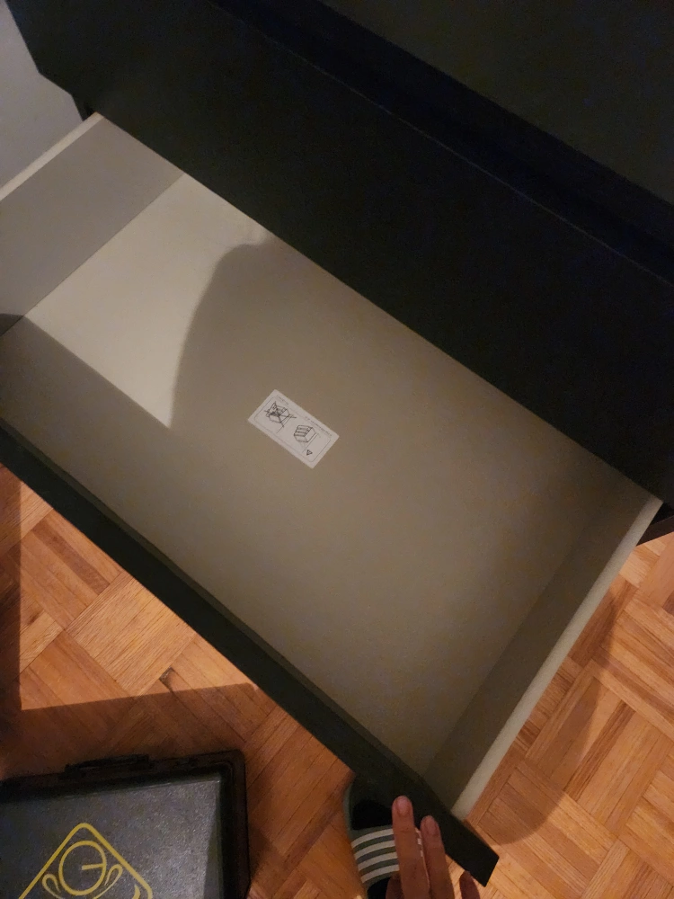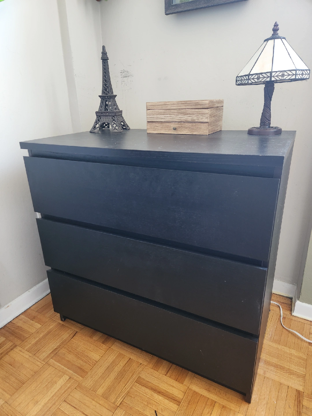 Selling a black IKEA Malm dresser with three drawers. It's in good condition and ready for a new home! Perfect for adding extra storage to any room.
