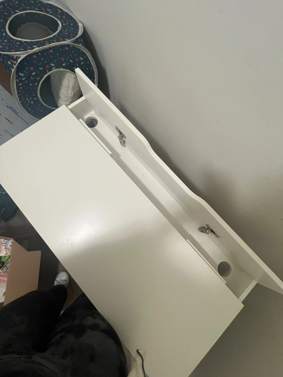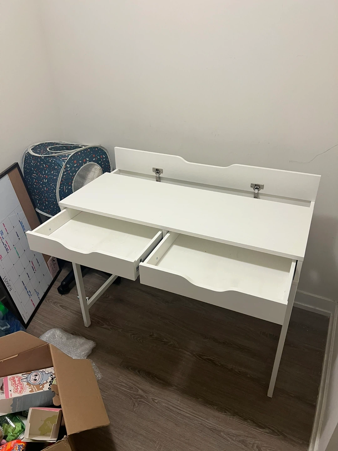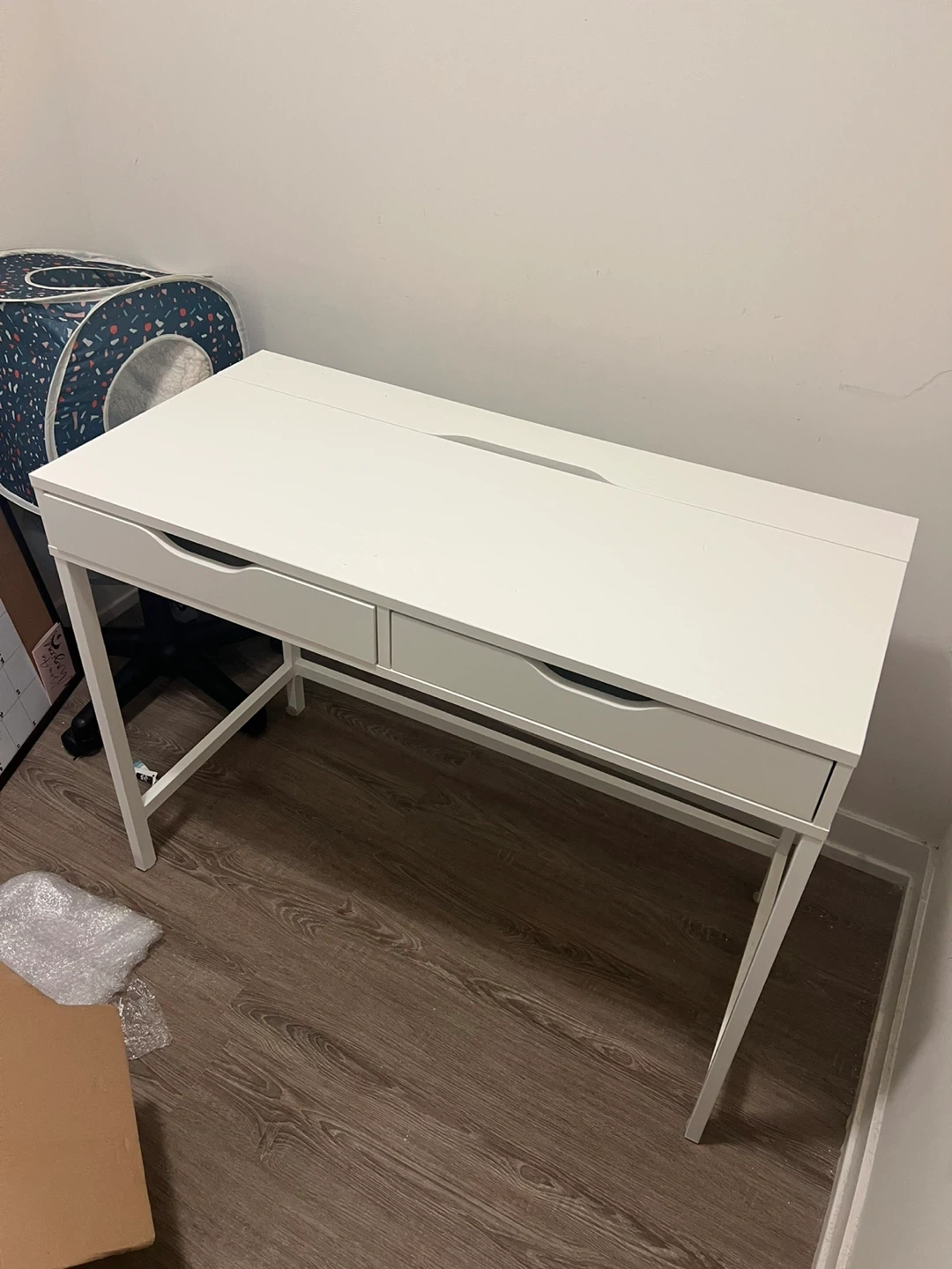 Selling a white desk from IKEA. It has a clean look and is in great condition. It features two drawers for storage. The dimensions are approximately 100 cm (39 3/8") in length, 48 cm (18 7/8") in width, and 76 cm (29 1/8") in height. Perfect for a home office or study space!