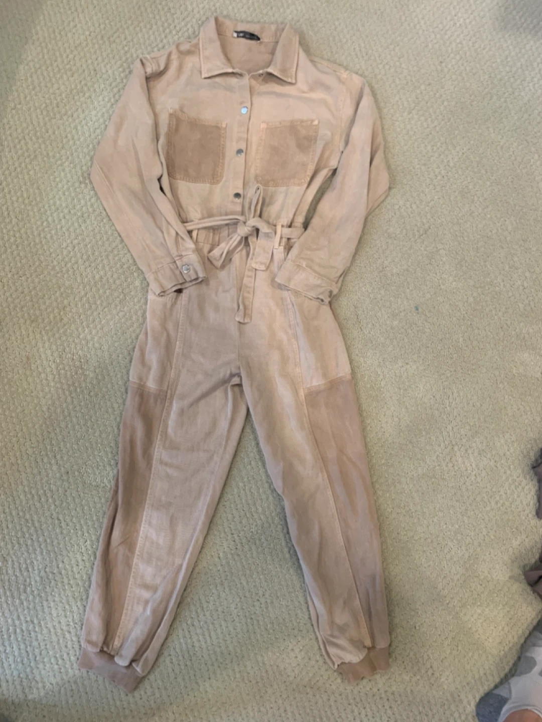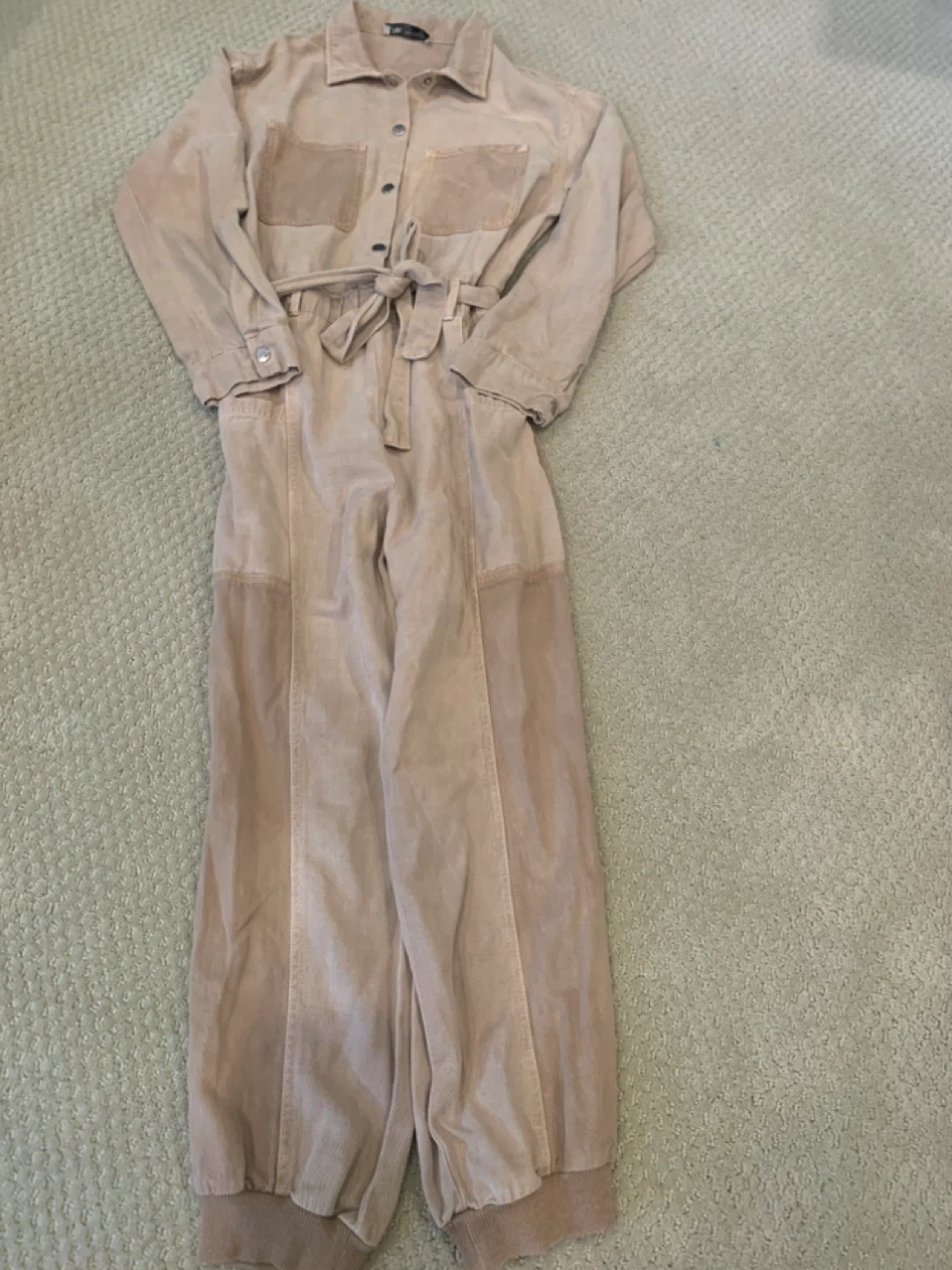 Selling a cute Zara jumpsuit in a neutral beige colour! It features a collared neckline, button-up front, and a tie waist. The size is 11-12.
