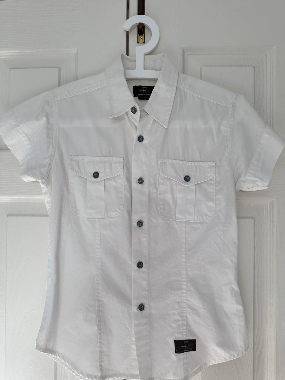 Here's a cute white short-sleeve shirt from Calvin Klein! It's in great condition and ready for a new home. Perfect for a casual day out or dressing up a bit. Size small and made in Hong Kong!
