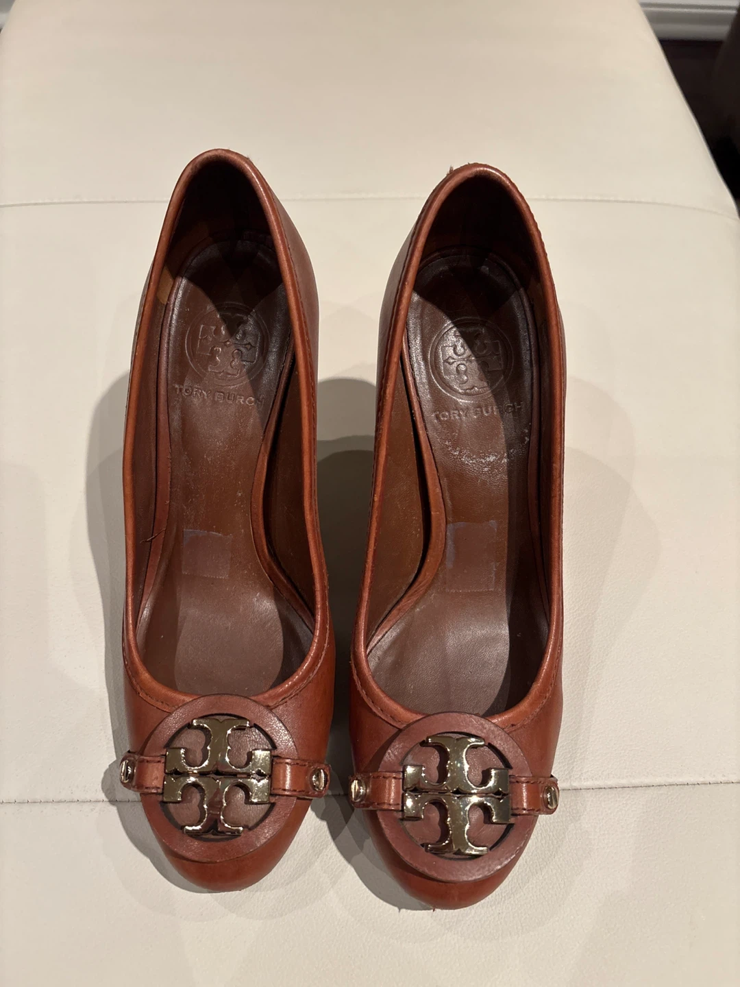 These are a pair of Tory Burch heels in a lovely brown leather. They feature the iconic Tory Burch logo on the front. They're in great condition and ready for a new home!
