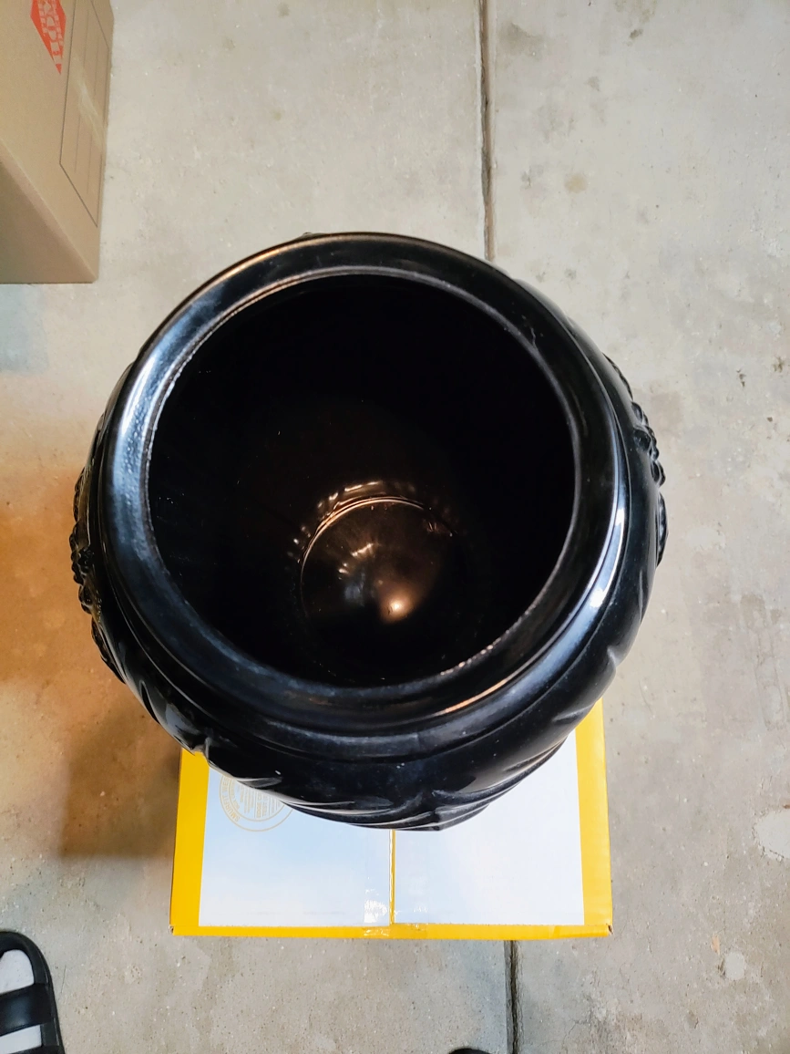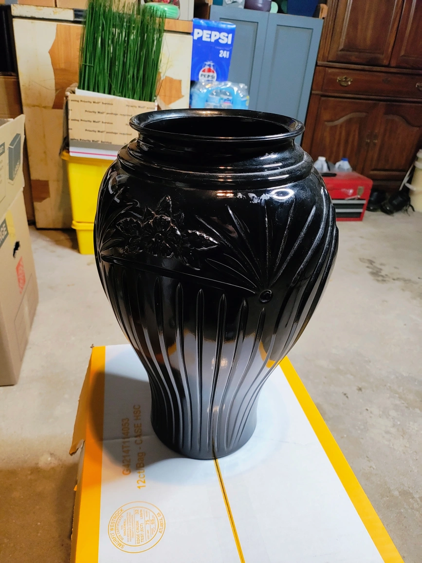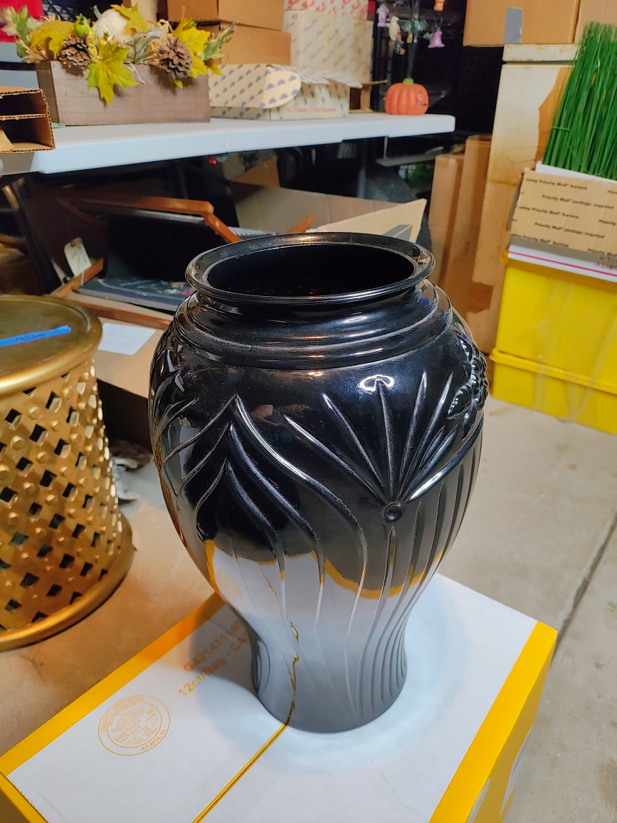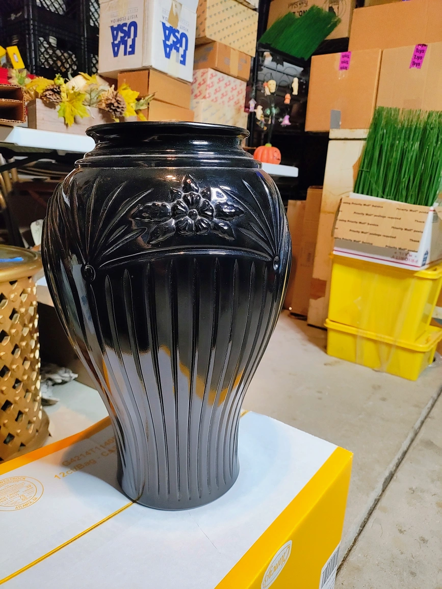 Selling a beautiful black decorative vase. It has a unique design with floral accents and vertical lines. Vintage Anchor Hocking Floor Glass Vase 16” Tall Ribbed Flower Art