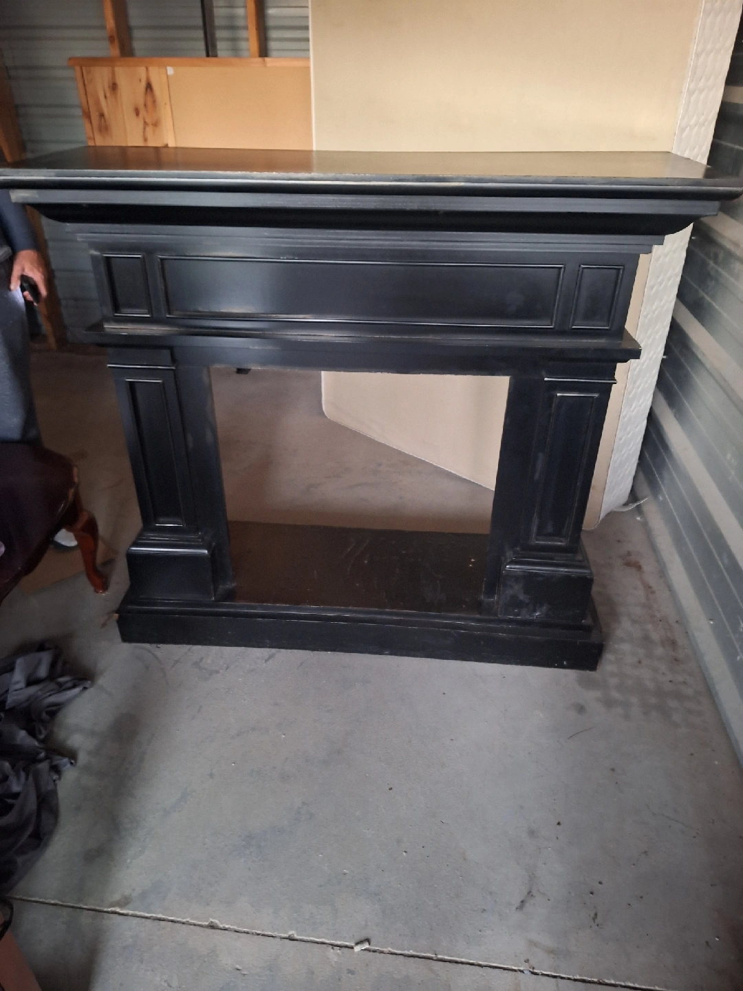 Selling a used fireplace mantel. It's black and has a decorative design. It shows some signs of wear, but it's still in good condition for use!