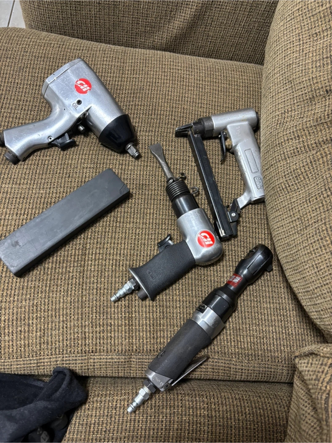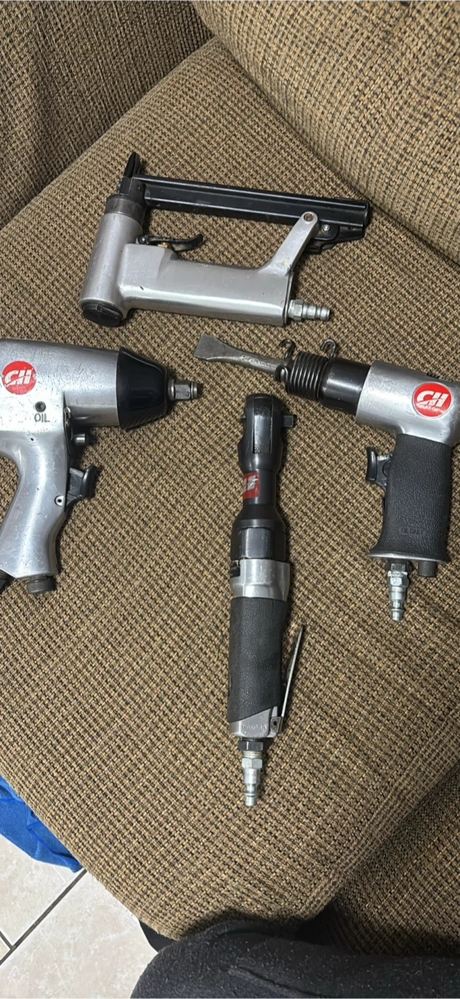 Selling a set of CII air tools! Includes an impact wrench, nail gun, air hammer, and ratchet. Great for any garage or workshop. See photos for condition and details