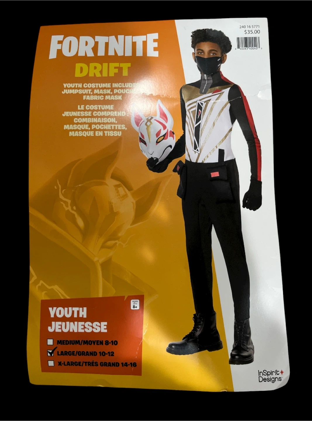 Selling a Fortnite Drift youth costume in size large (10-12). The costume includes the jumpsuit, pouch, and fabric mask. It's in good condition and ready for Halloween or cosplay!