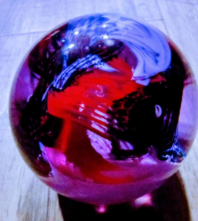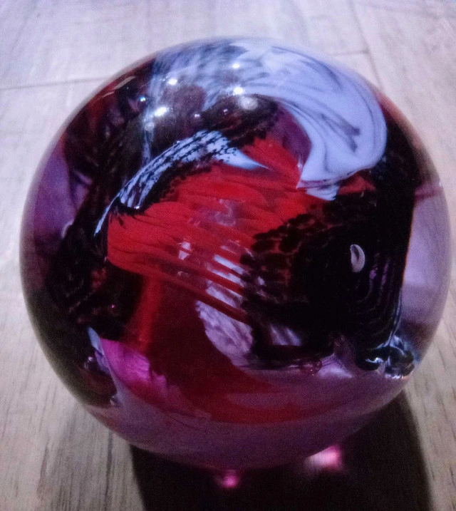Add a touch of elegance to your collection with this Caithness Glass paperweight, handcrafted in Scotland. This beautiful piece features stunning swirls of red, purple, white, and black, creating a mesmerizing visual display. The paperweight is in used but good condition, showing its history and charm. It measures approximately 3 inches in diameter and comes with its original box. Ideal for collectors or as a sophisticated decorative item for your home or office.