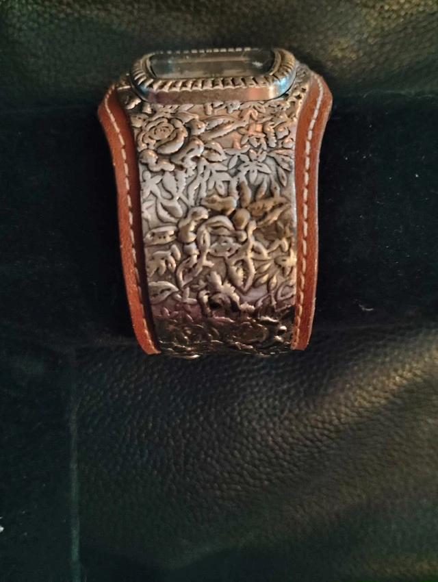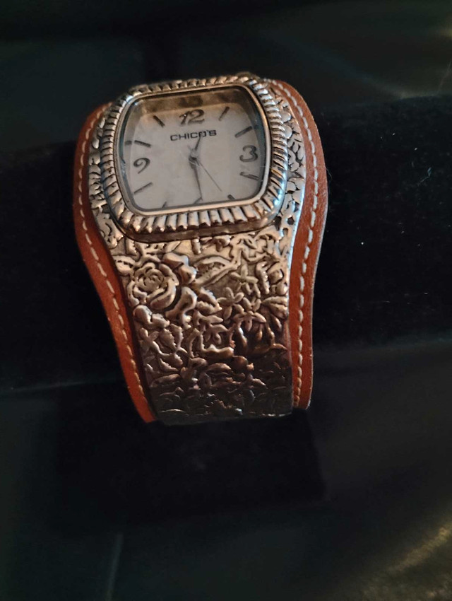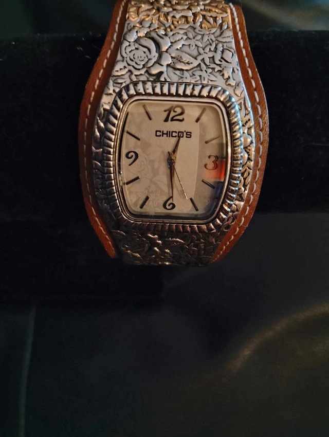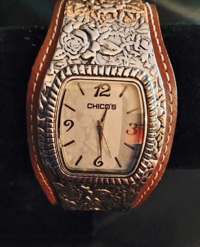 This is a new Chicos bangle watch, a stylish accessory that combines the functionality of a timepiece with the flair of a bangle bracelet. The watch features a square face with easy-to-read numerals and a date display, encased in a decorative silver-tone metal. The attached wide bangle is crafted from a matching silver-tone material with a floral design and a brown leather cuff.