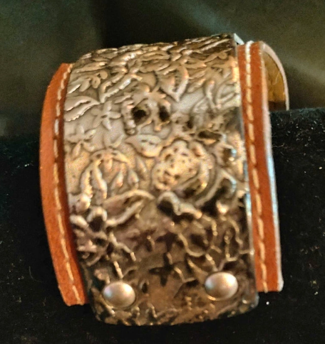 - Material: Silver-tone metal, leather