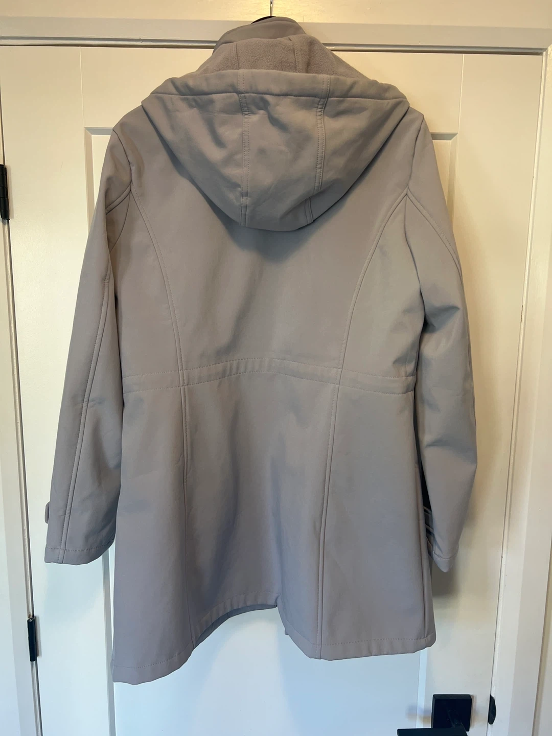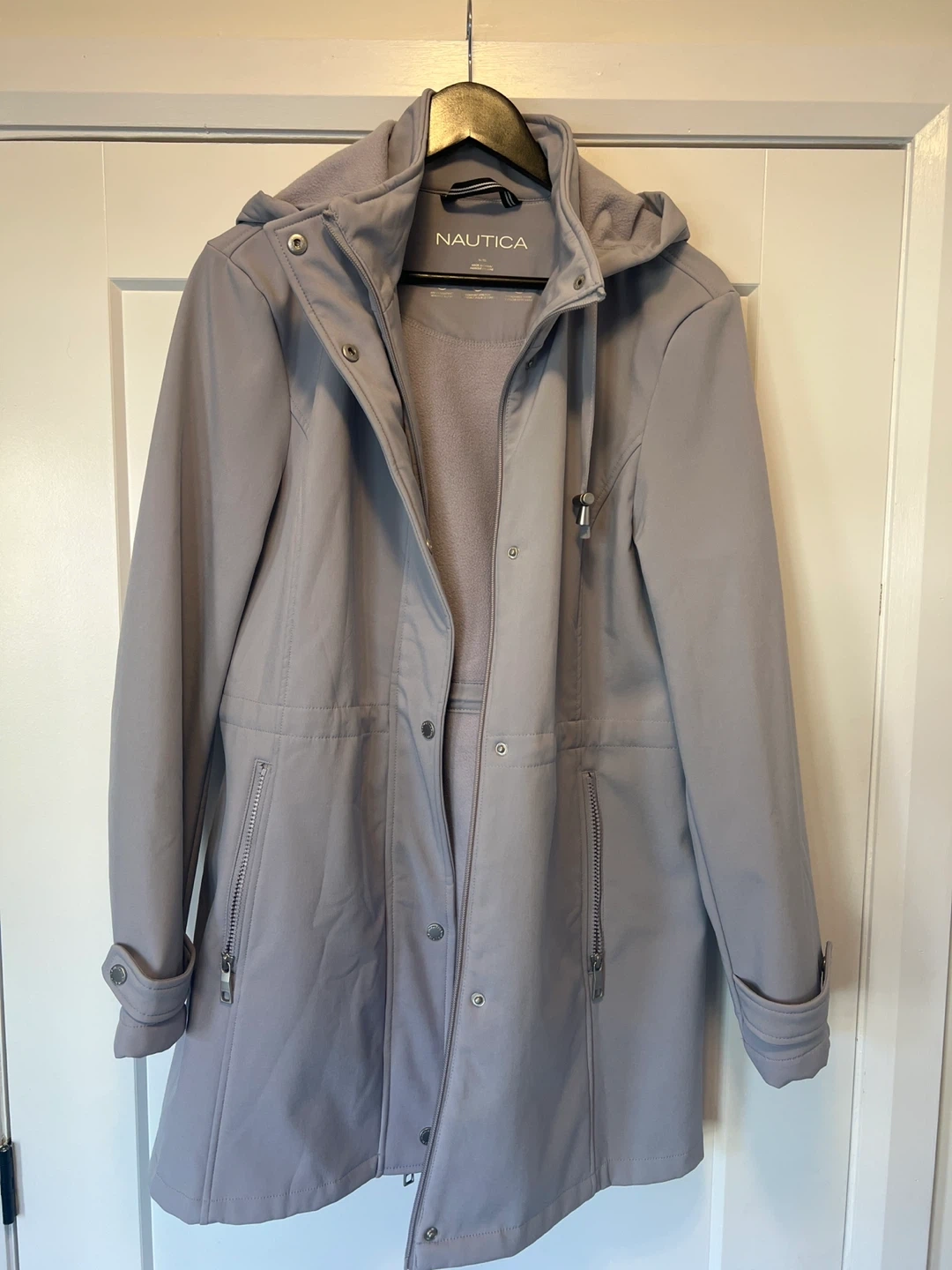 Selling a Nautica Fall/winter coat, in size XL/TG. It's a lovely light purple colour and features a detachable hood. The material is water-resistant and has a comfortable stretch to it. Perfect for those snowy days!