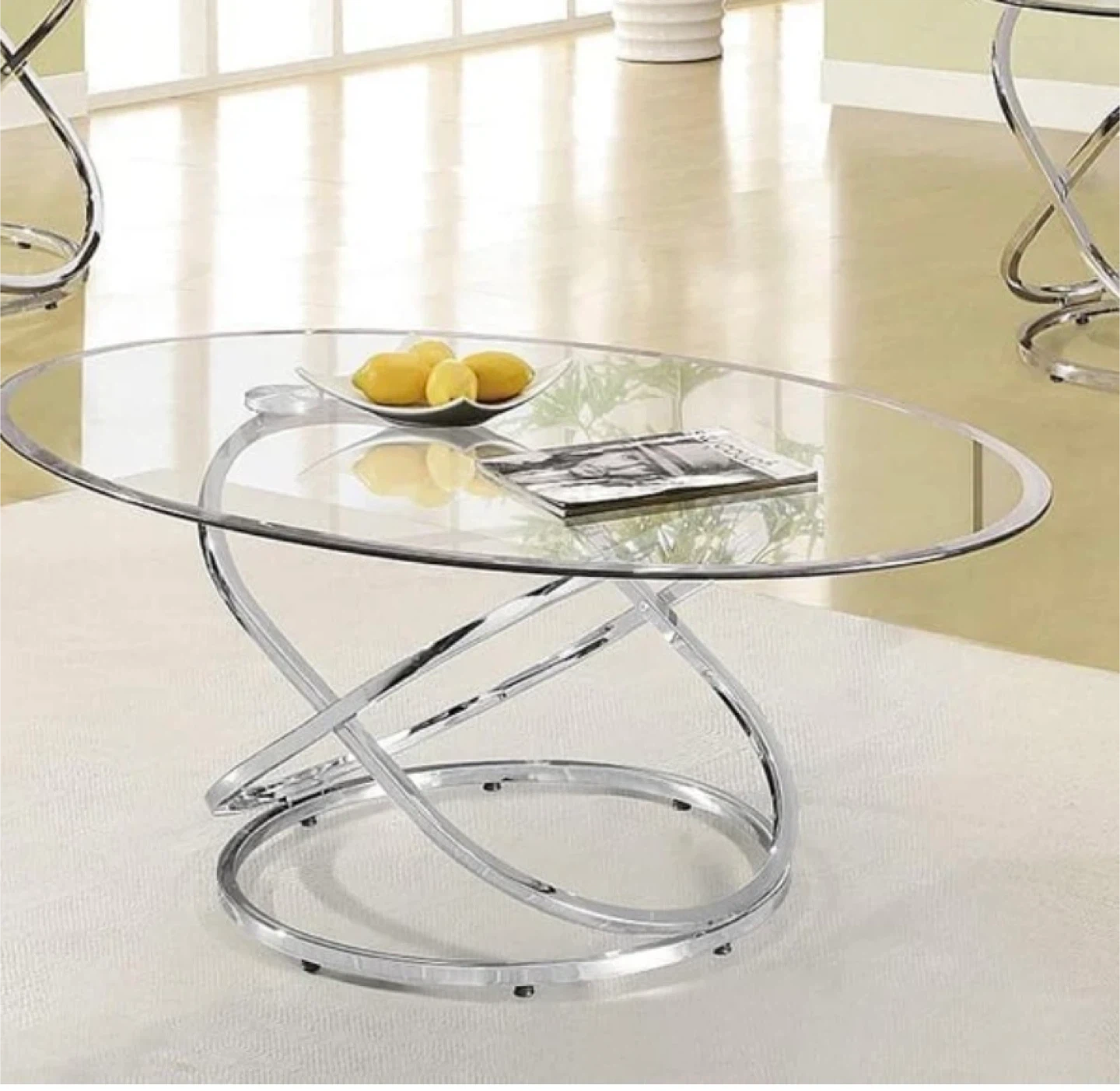 Selling a stylish oval glass coffee table. It features a unique chrome base that adds a modern touch to any living room. The glass top is perfect for displaying items or enjoying a cup of coffee. A great addition to your home decor!
