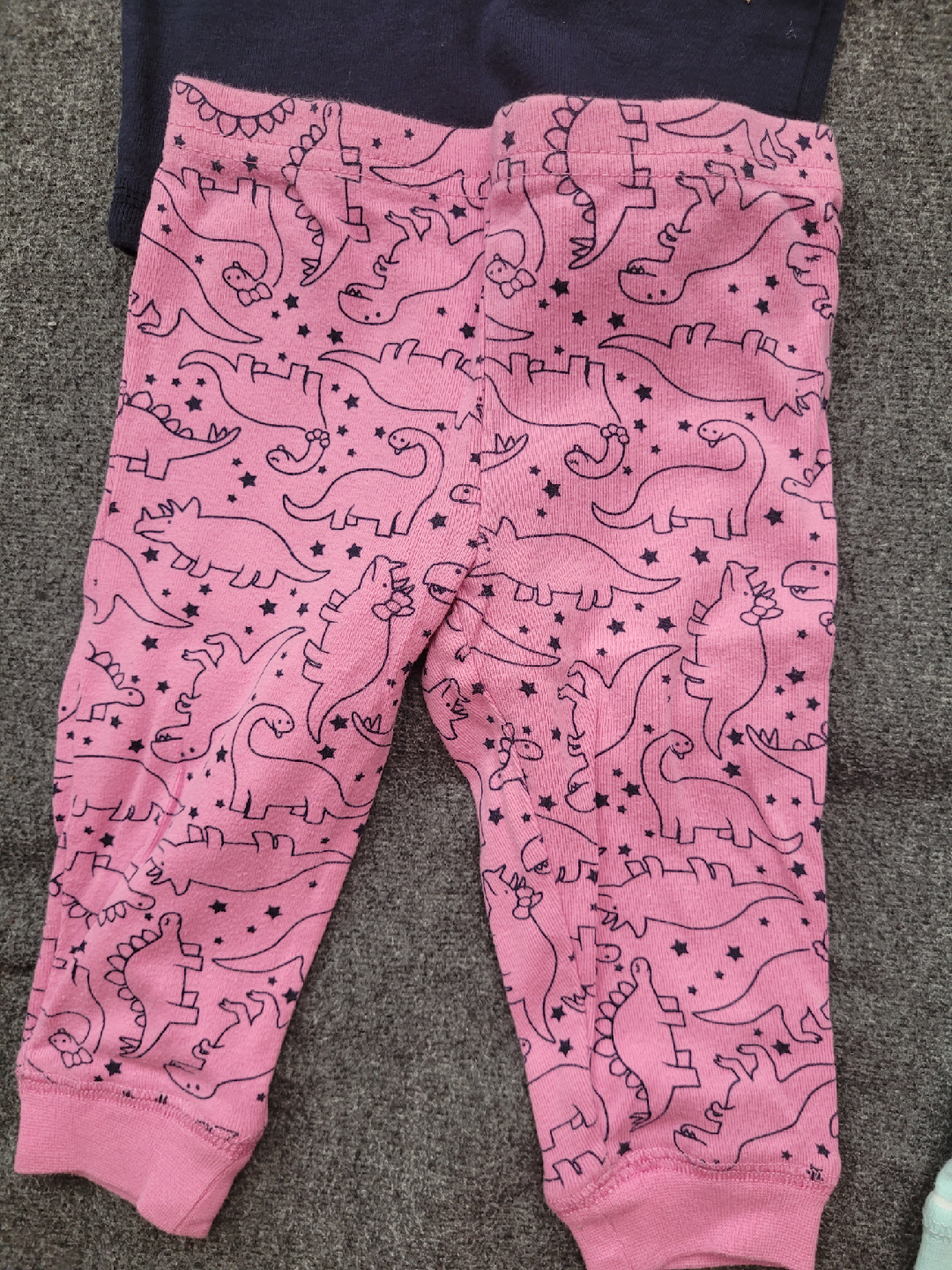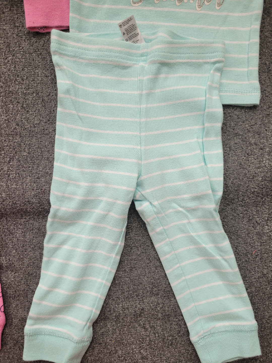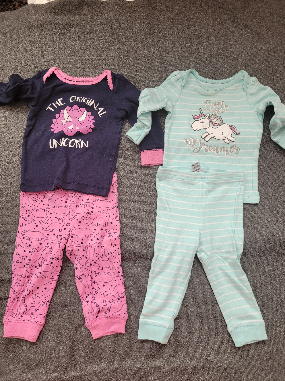 Two adorable pajama sets for a baby girl! One is a light blue and white striped set with a "Little Dreamer" unicorn design. The other set is navy with a pink trim and features a "The Original Unicorn" design with pink dinosaur-themed pants. Both are perfect for cozy nights!