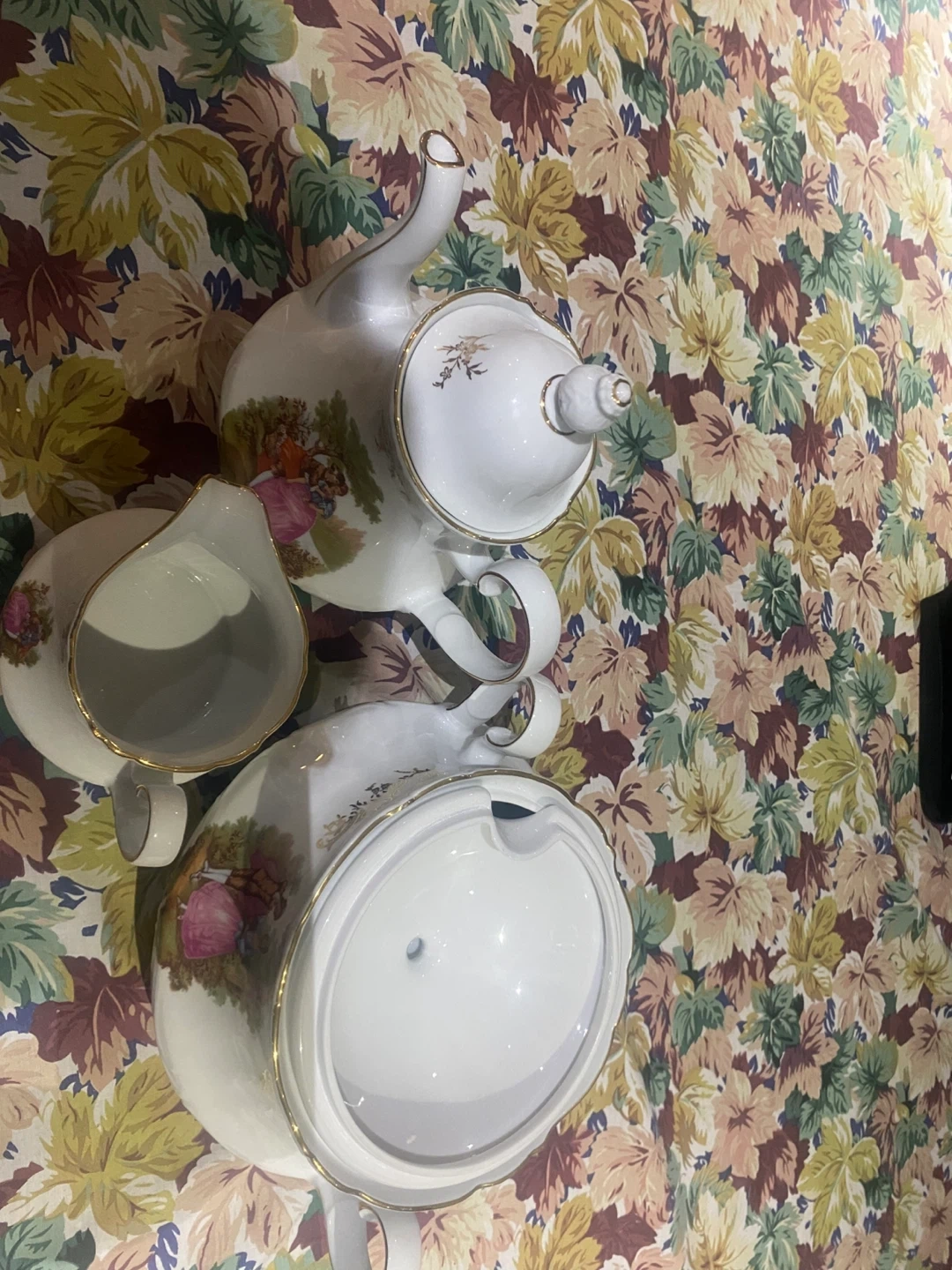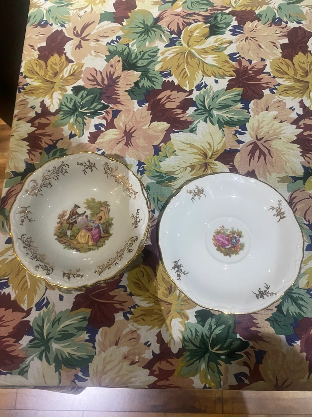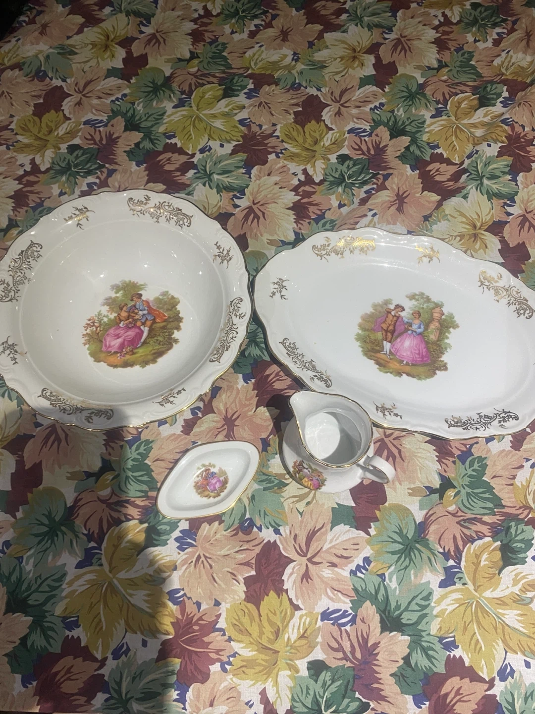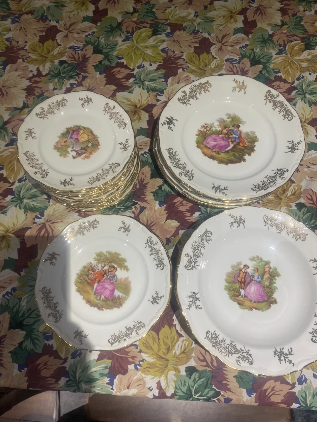 Selling a vintage porcelain china set. It features a beautiful design with gold trim and a central image of a couple in period attire. The set includes various pieces such as plates, bowls, teacups, and serving dishes. It would be a lovely addition to any collection or a special occasion dinnerware set
