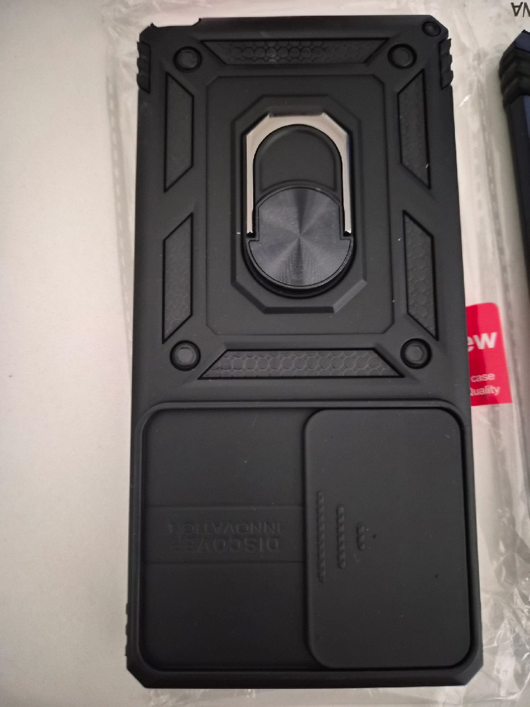 This is a black phone case with a ring holder on the back for easy grip and a sliding cover to protect the camera lens. It looks to be in good condition!
