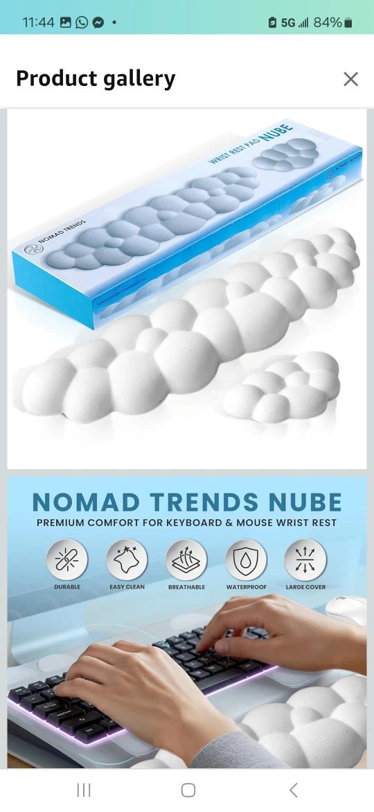 This is a Nomad Trends Nube keyboard and mouse wrist rest. It's designed for premium comfort and support during long hours of work or gaming. It's durable, easy to clean, breathable, and waterproof. The material is PU leather memory foam with a silicone anti-slip base, offering soft and slow rebound support. 2 pack mouse and keyboard set, $10.