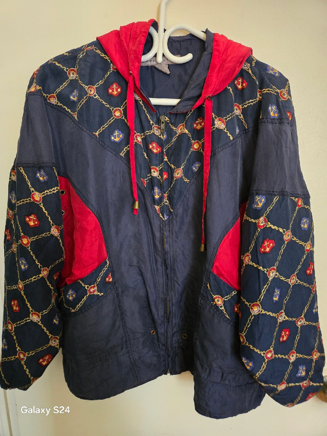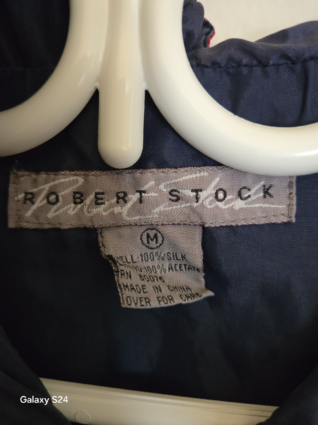 Selling a Robert Stock jacket in size medium. It's made of 100% silk and 100% acetate. The jacket has a unique design with red accents and a hood.