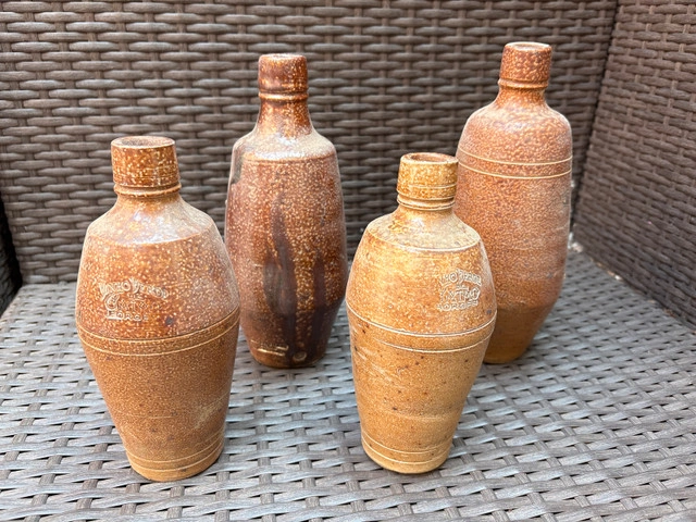 All for $5!! Add a touch of rustic charm to your home decor with these old Portuguese wine jugs! These unique stoneware vessels feature a speckled glaze and an embossed logo that reads 'VINHO VERO DE CXTRO GORGE.' Perfect for collectors or anyone who appreciates vintage pottery, these jugs are sure to be a conversation starter. Please note that these are used items and may show signs of wear consistent with their age.