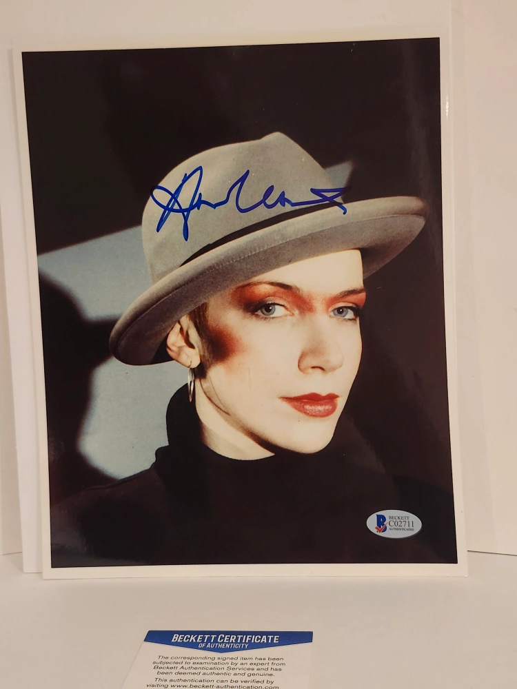Selling a signed 8 x 10 photo of Annie Lennox, authenticated by Beckett Authentication Services. It comes with a Beckett Certificate of Authenticity with certification serial number C02711. A great piece for any fan or collector!