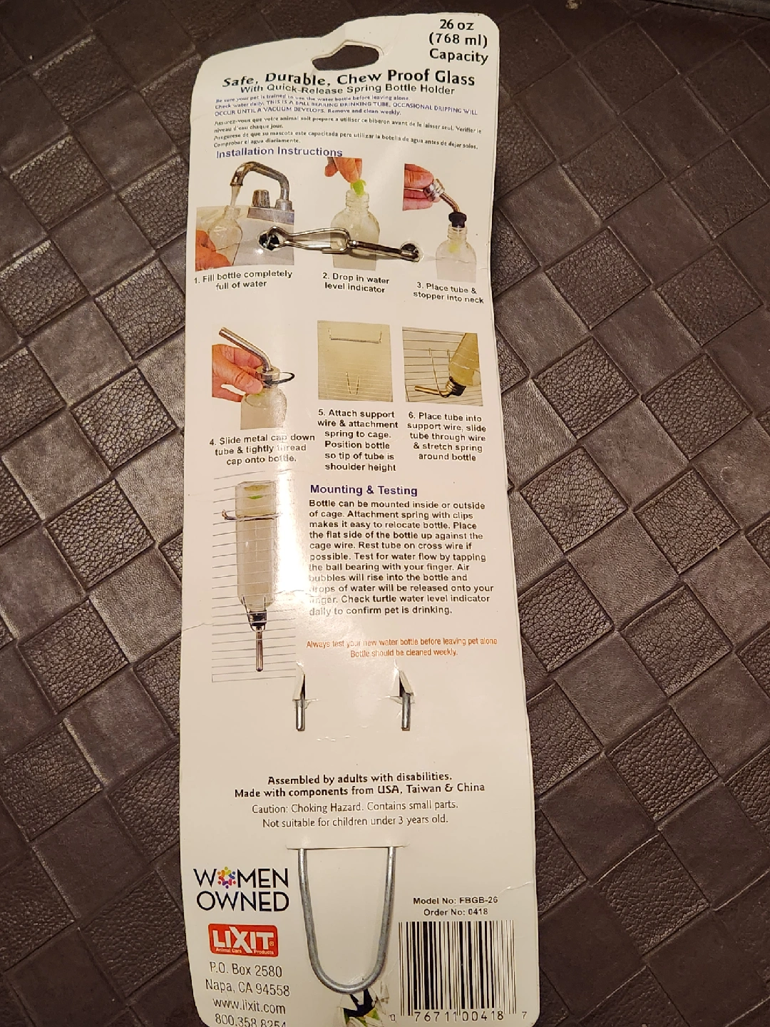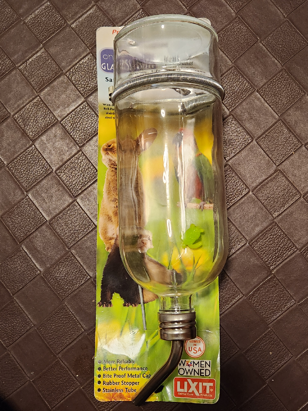 This is a Lixit chew proof glass water bottle for small animals. It holds 26oz (768 mL) of water. It is made with a quick release spring bottle holder. It is safe, durable, and easy to install. Features include a bit-proof metal cap, rubber stopper, and stainless steel tube.