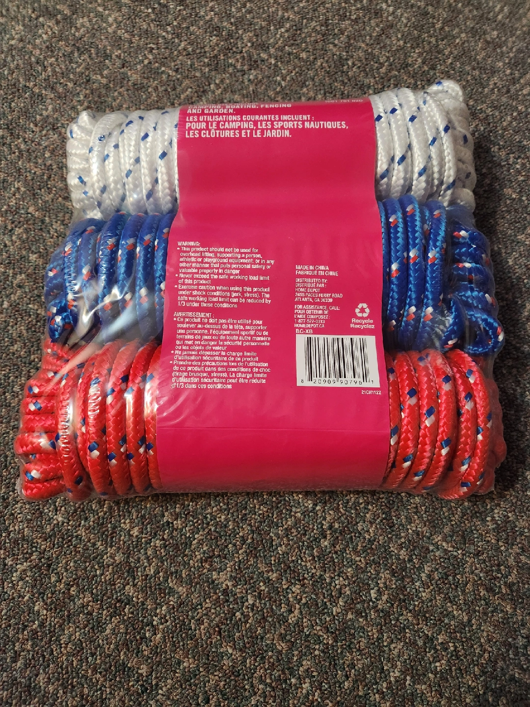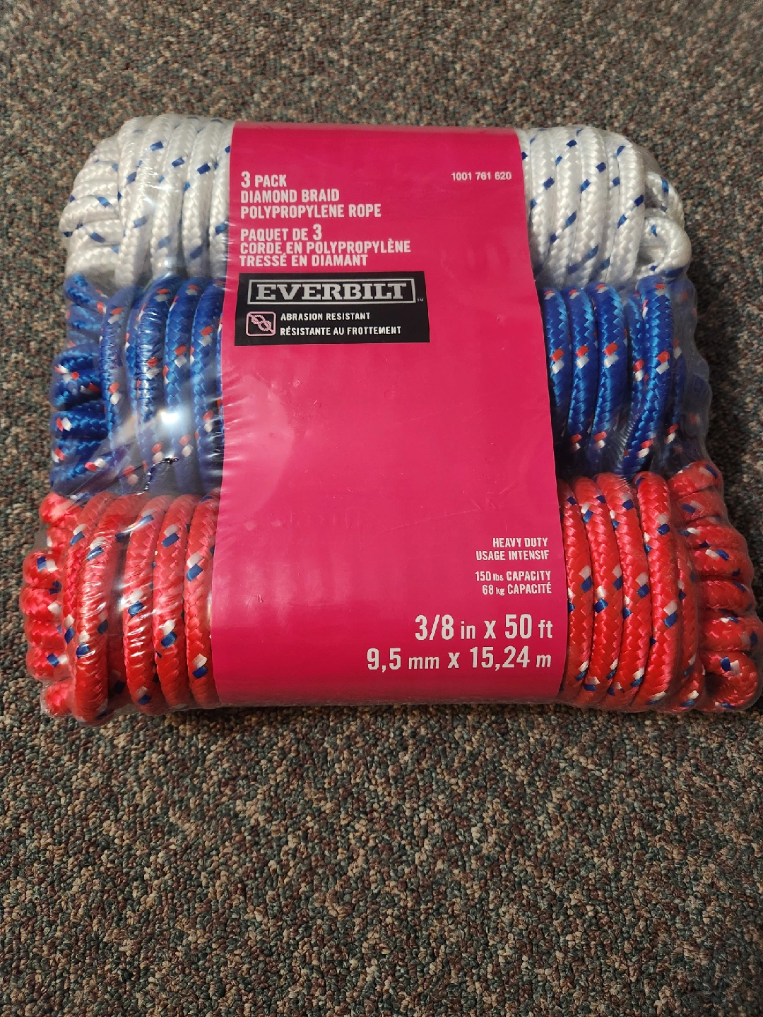 Selling a 3-pack of Everbilt diamond braid polypropylene rope. Each rope is 3/8 inch in diameter and 50 feet long (9.5 mm x 15.24 m). Great for camping, boating, fencing, and garden use! Heavy duty with a 68 kg capacity