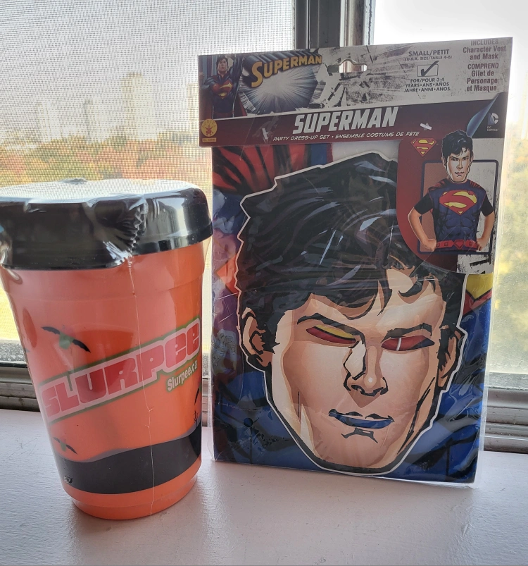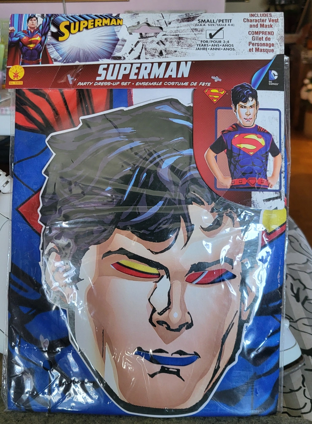 Selling a brand new Superman Halloween Costume set! It includes a character vest and mask, perfect for a young superhero. Size is small and recommended for ages 3-4 years. Also a collectible 32 oz Halloween Mug with handle included for trick or treating, or holding snacks, drinks or even small toys!