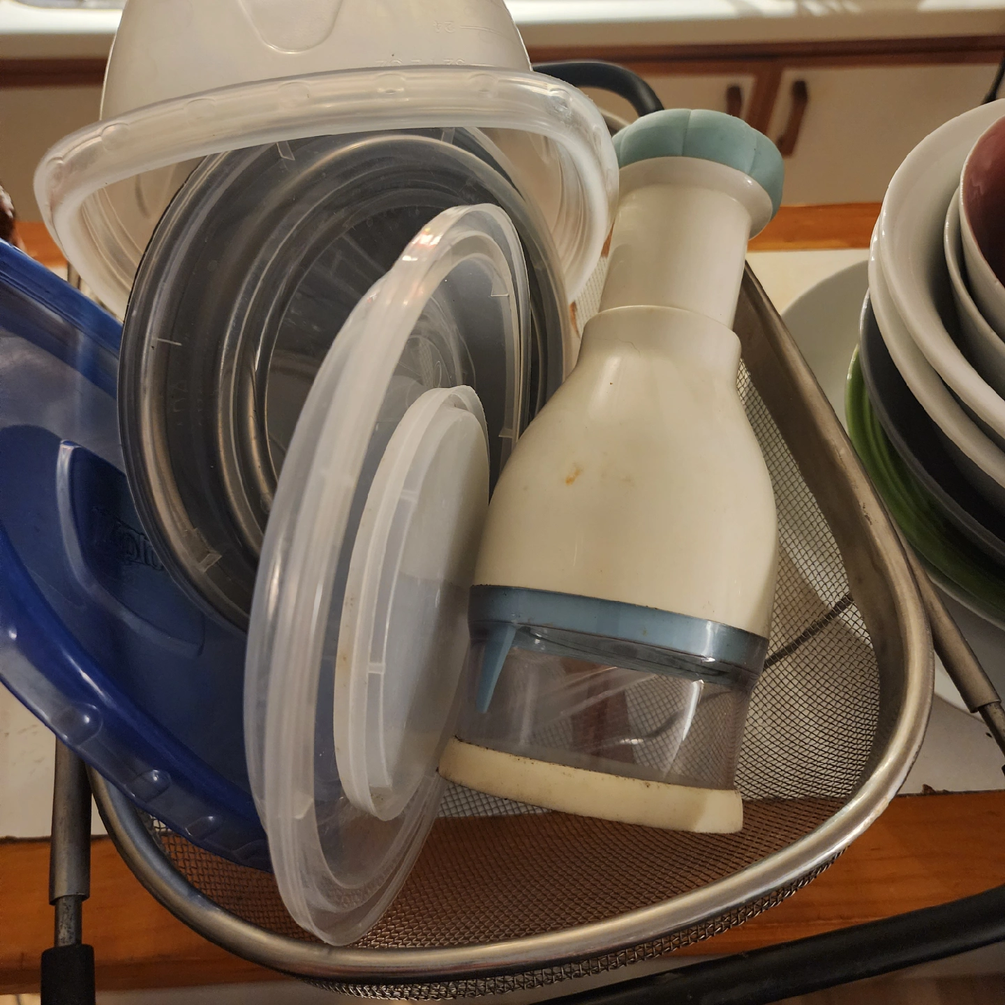A large strainer with handles that secure it over a sink. Assorted tupperware and a handpress chopper.