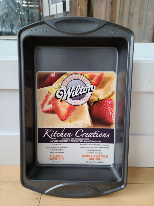 Selling a brand new Wilton kitchen creations oblong cake pan. Premium non-stick bakeware, it is made of a durable construction and prevents warping. Features: - Superior non-stick performance with serving convenience and elegant design - Quick release of baked goods and easy clean-up - Even heating - Oversized handles and oven mitt thumb grip make handling safe and easy even when pan is hot - Dimensions: 13 x 9 x 2” (33 x 22.9 x 5cm ) - Dishwasher safe Comes from a smoke & pet free home.