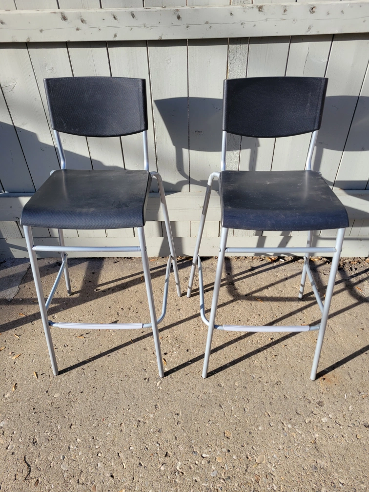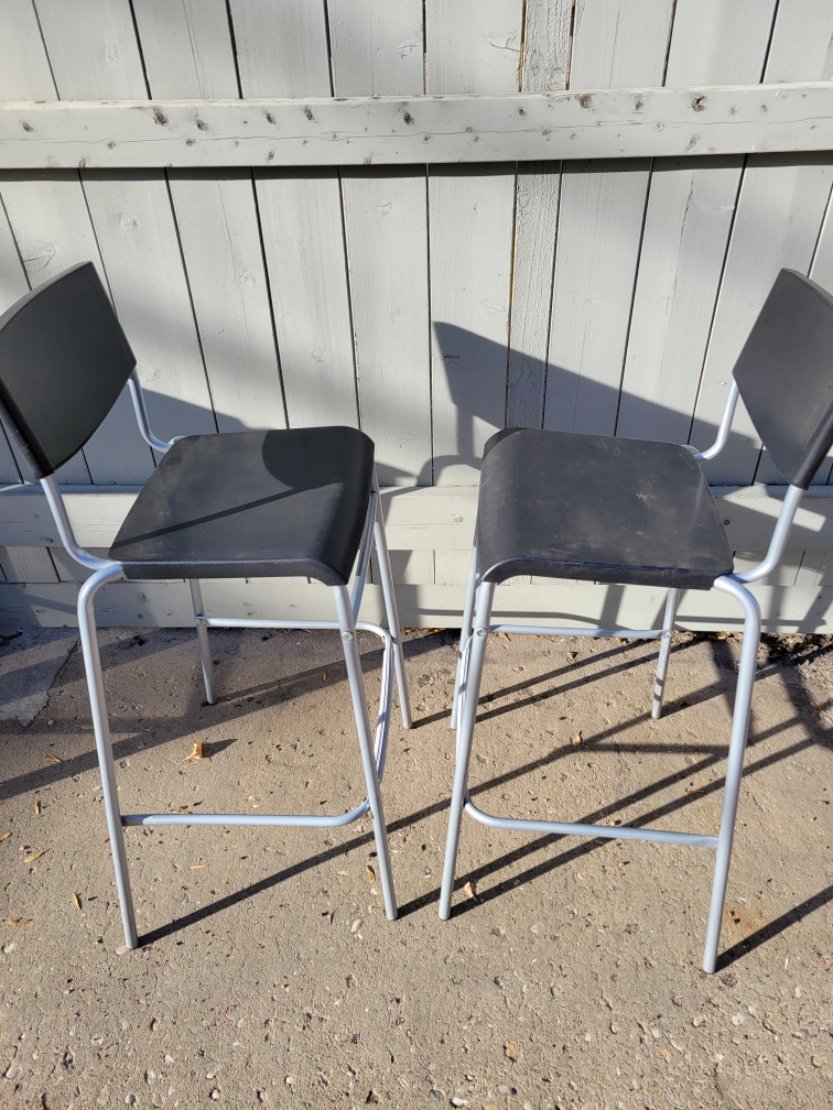 Selling a set of two IKEA Stig bar stools. They're in good condition and ready for a new home. The stools have a black seat and a silver-coloured frame. Perfect for a kitchen island or bar area! Retail for $25 each at Ikea.