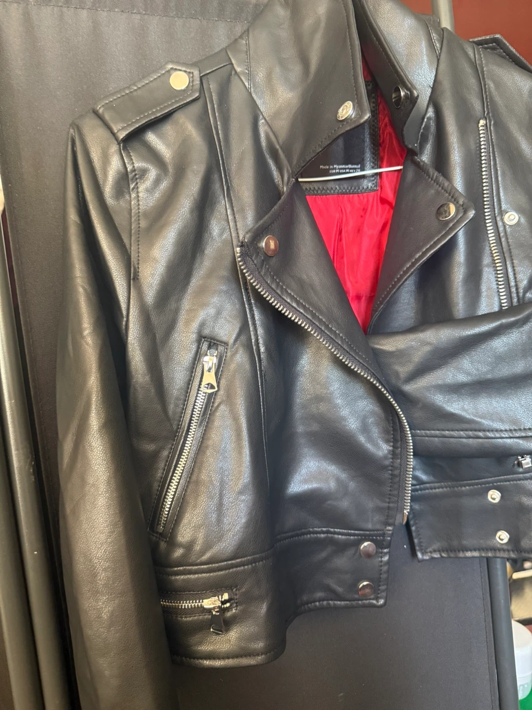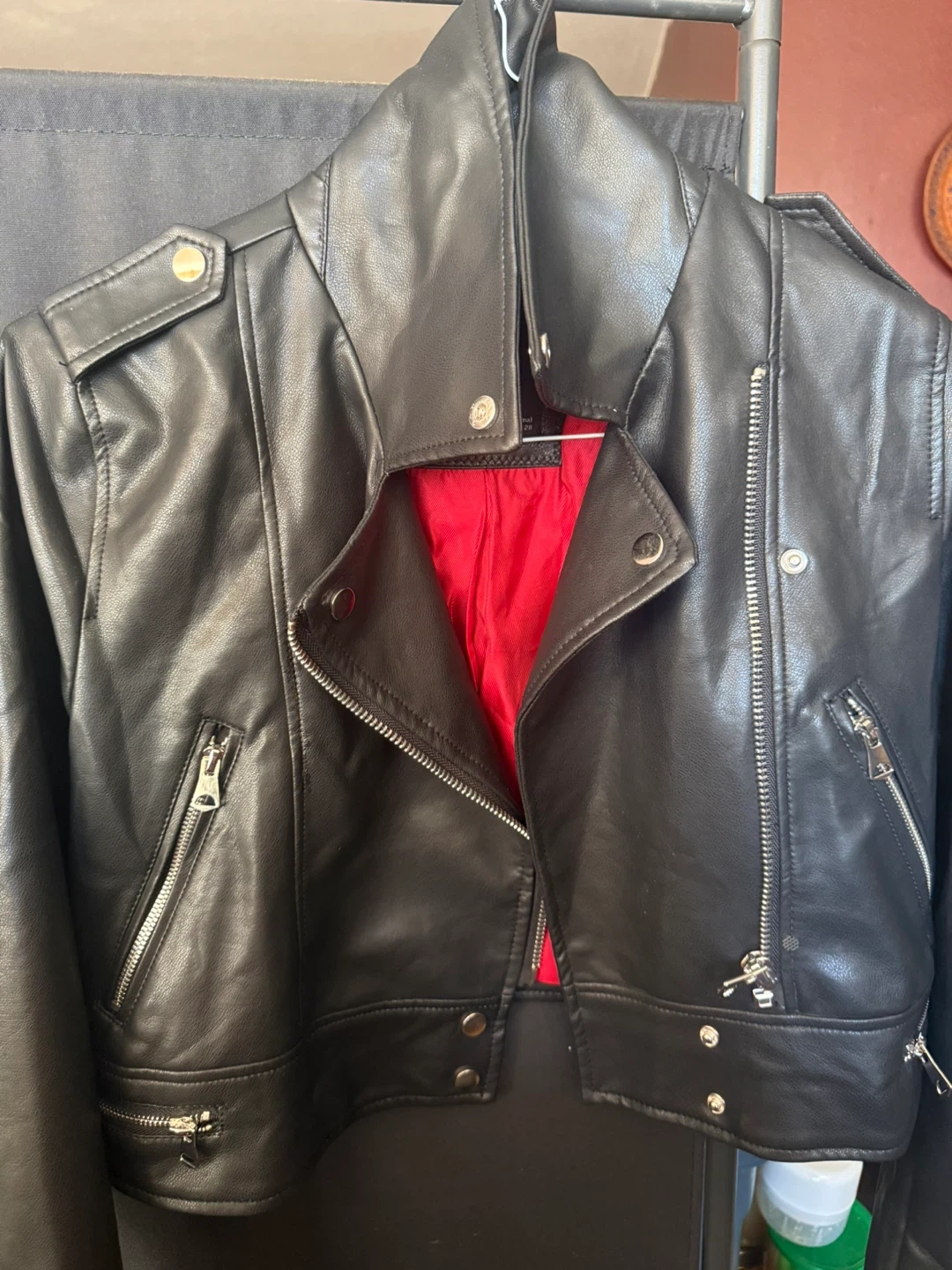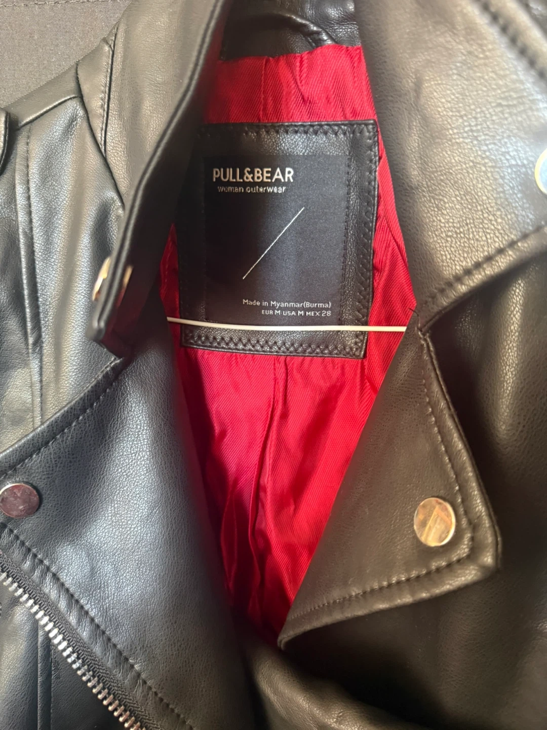 Selling a Pull&Bear faux leather biker jacket in black. It's a size M and has a stylish red lining. Great for adding a bit of edge to any outfit! It’s new wear only once. Located at 4000 Lawrence Ave.
