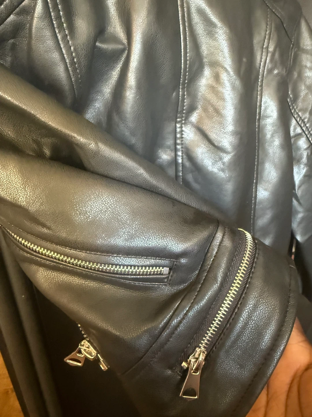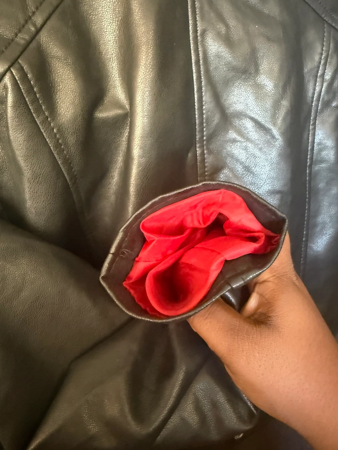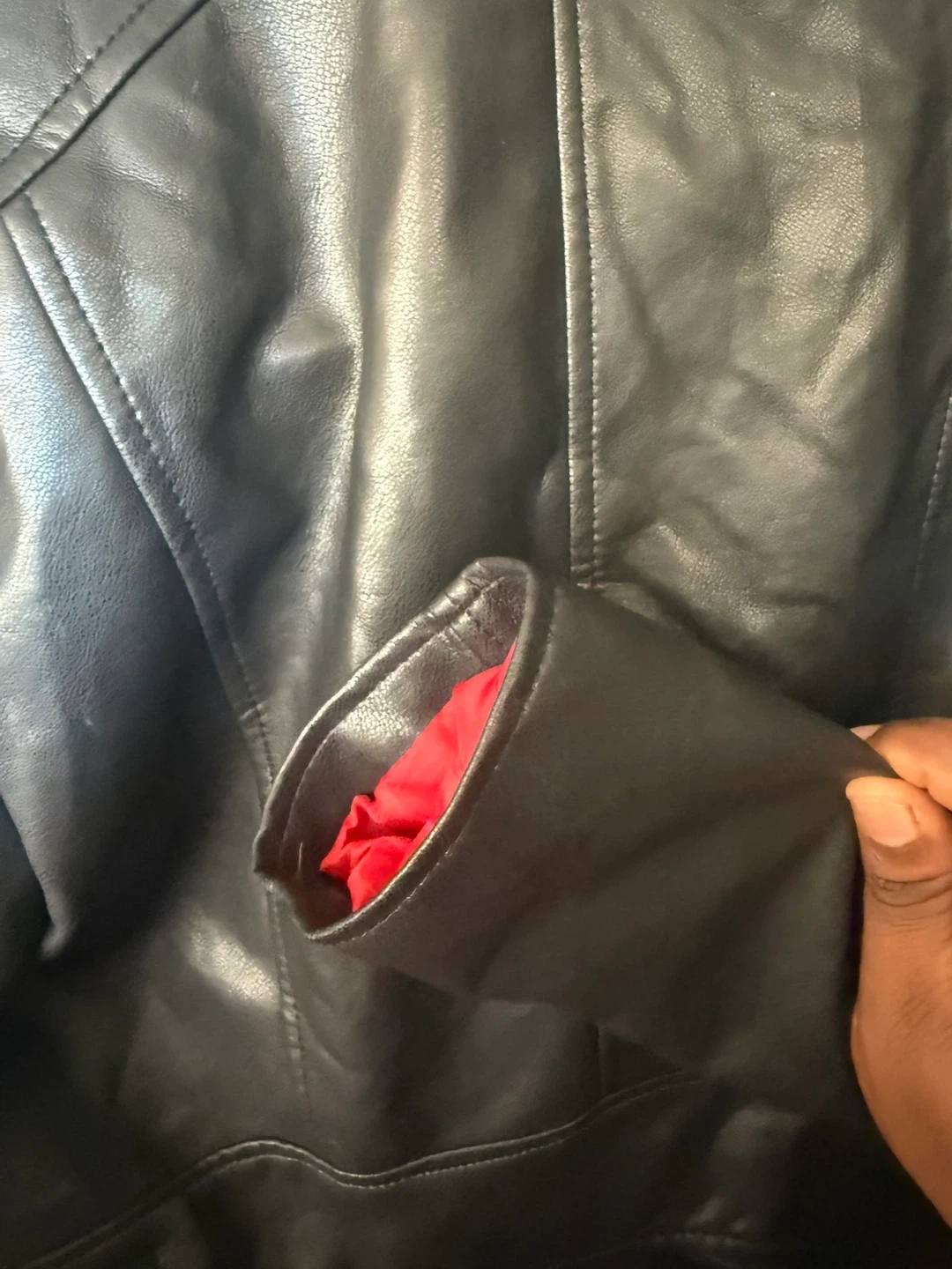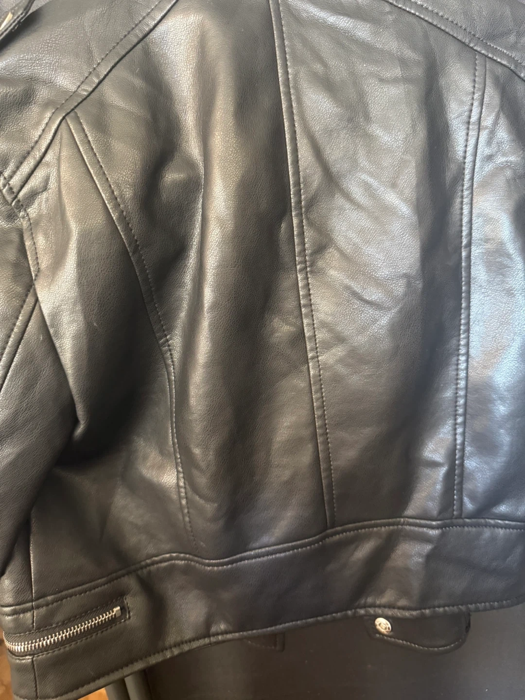 Selling a Pull&Bear faux leather biker jacket in black. It's a size M and has a stylish red lining. Great for adding a bit of edge to any outfit! It’s new wear only once. Located at 4000 Lawrence Ave.