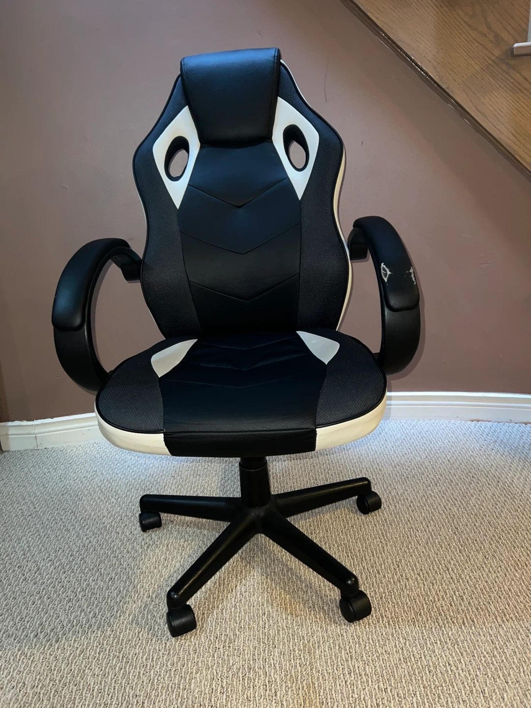 Comfortable black and white racing-style office chair in good working condition. Swivels, rolls smoothly, and has adjustable height. Great for home office, study, or gaming setup.