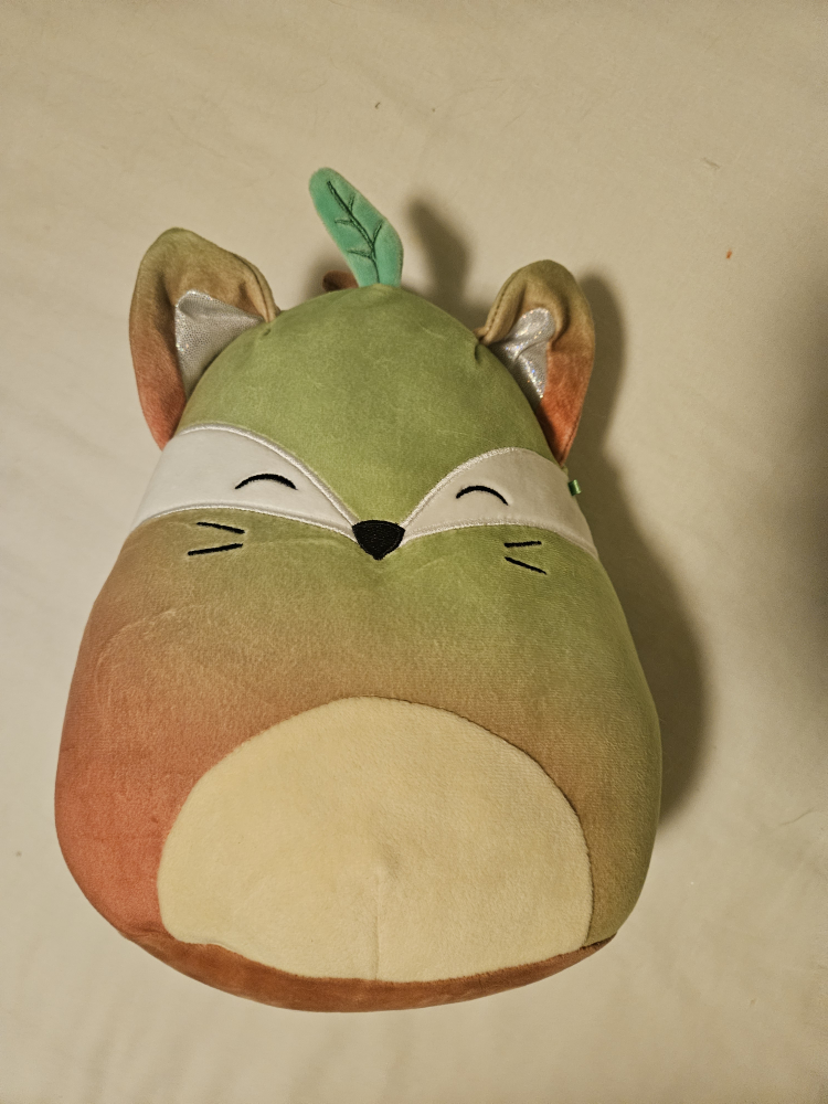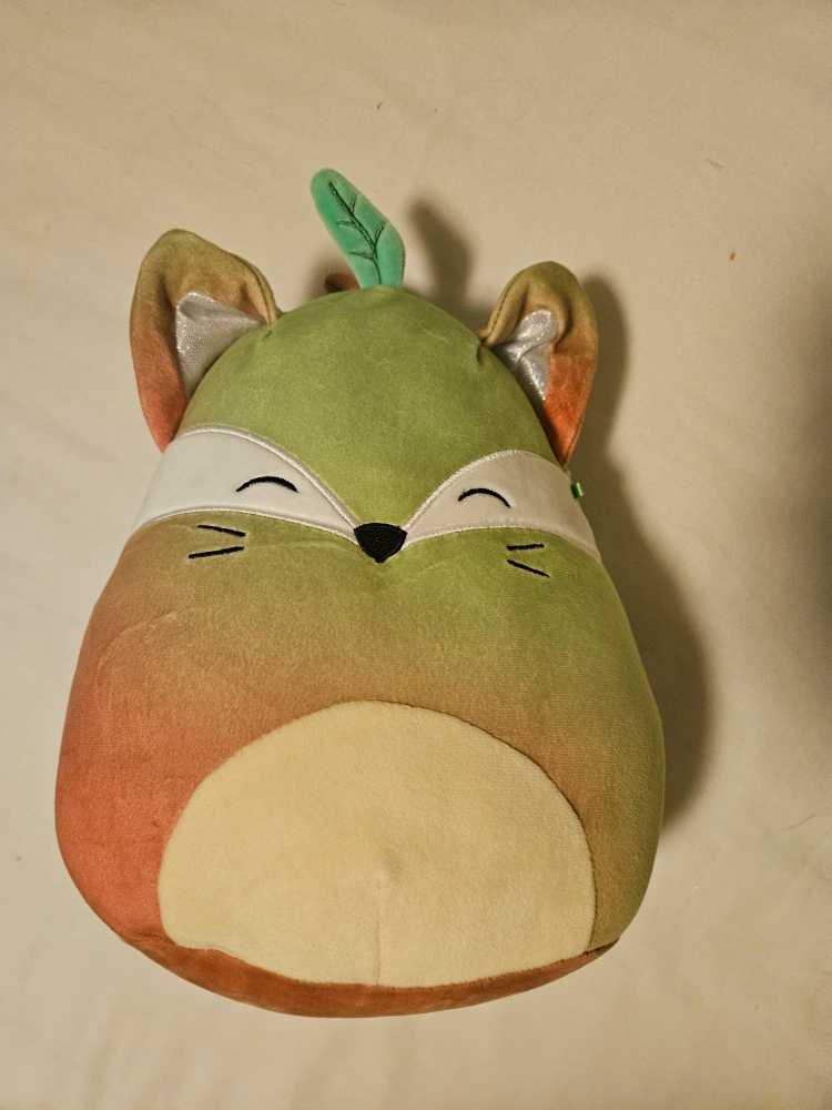 Selling two adorable stuffies! One is a cute Squishmellow fox (or peach?) with a leaf, and the other is a smiling watermelon slice. They're both in great shape and ready for a new home