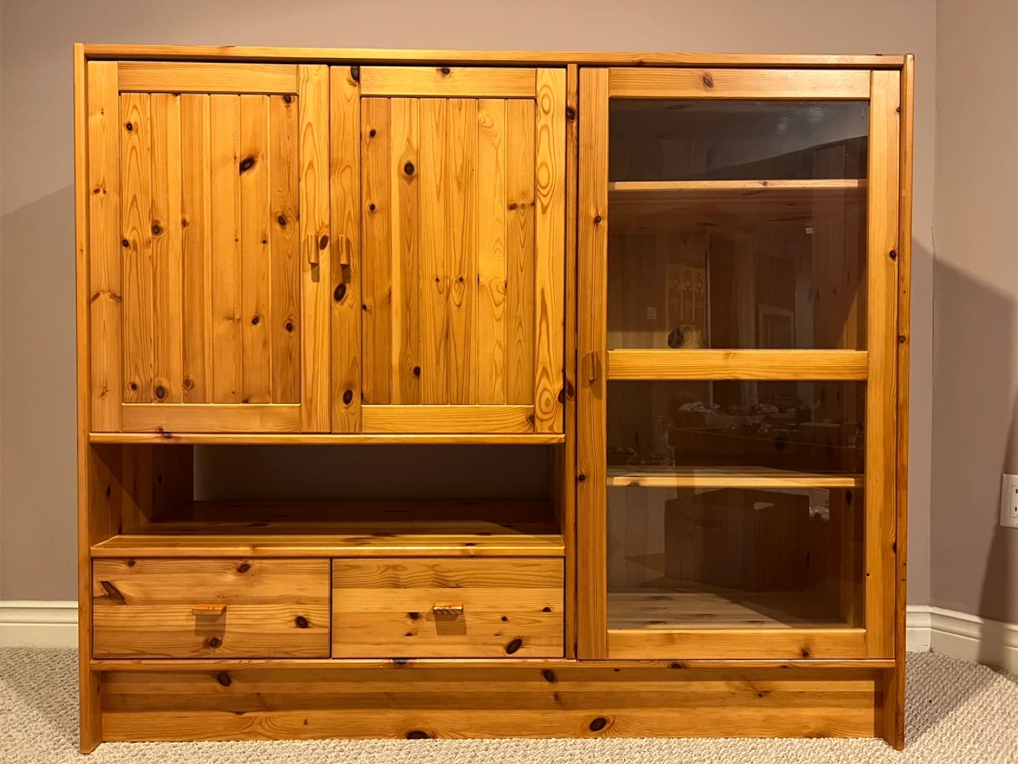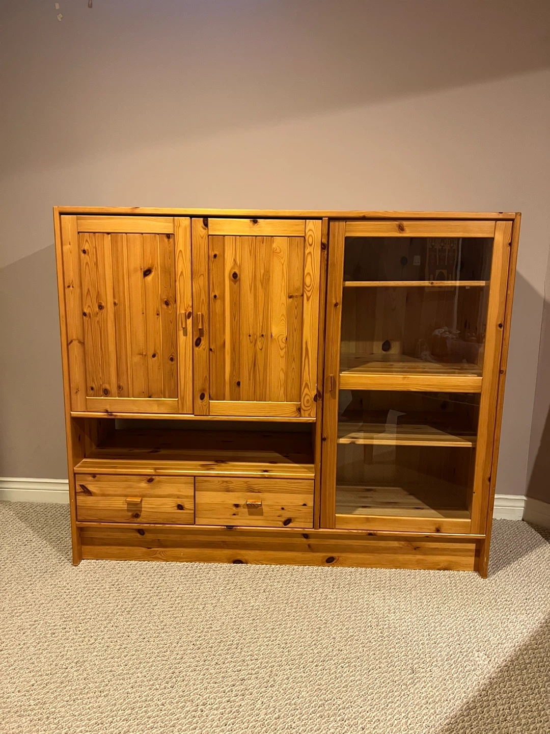 Charming solid pine cabinet in excellent condition. Great for storage, display, or as a statement piece in any room. πŸ“ Dimensions: 55” wide x 17.5” deep x 46.5” high ✨ Features: β€’ 4 shelves (including glass-front display section) β€’ 2 lower drawers β€’ Double-door cupboard with interior storage β€’ Natural pine wood with beautiful grain and warm finish This piece is versatile – use it for dining room storage, books, collectibles, or media setup. Condition: Very good. Clean and well cared for. Location: Thornhill - Bathurst & Centre