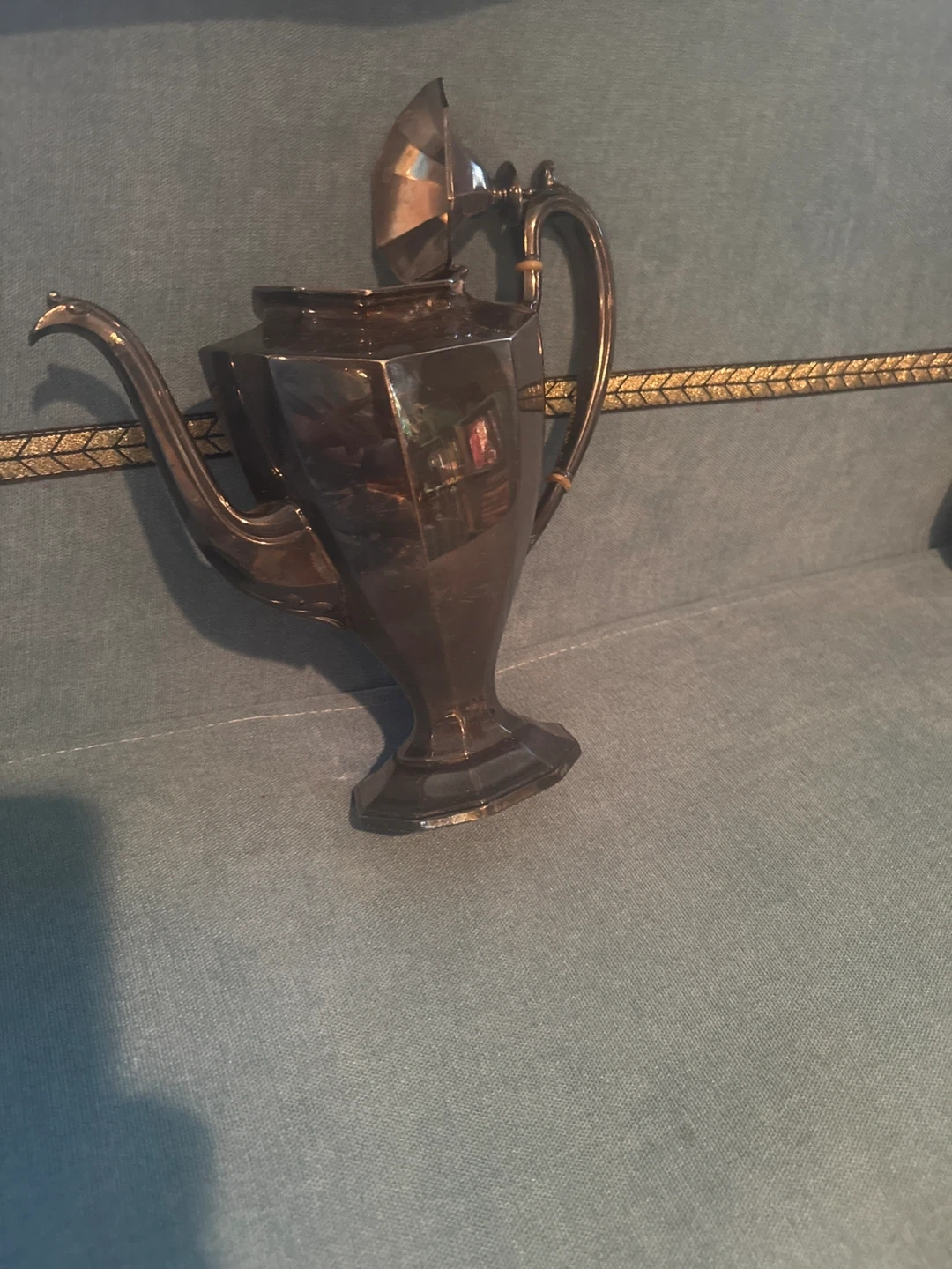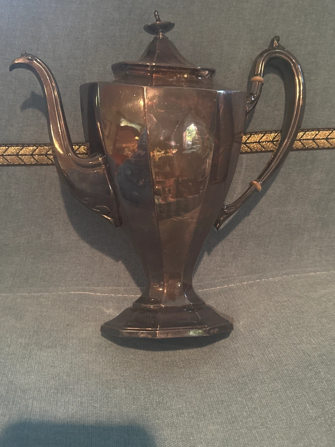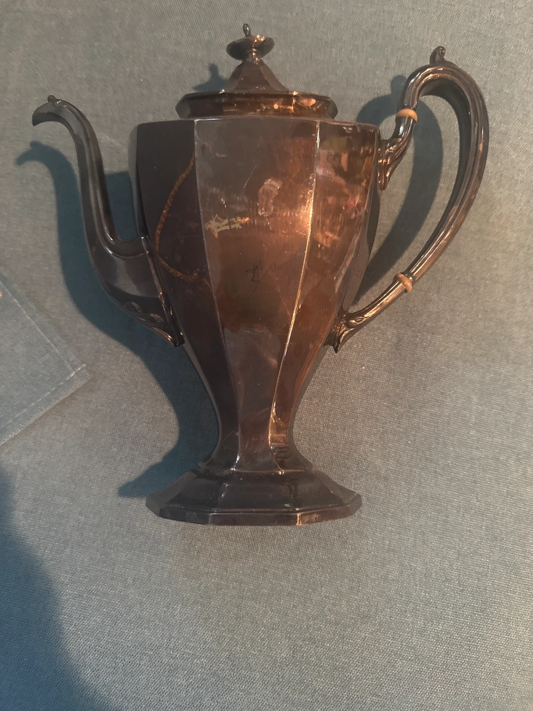 Selling a vintage silver teapot. It has a unique, angular design and is in good condition for its age. Perfect for adding a touch of elegance to your tea time