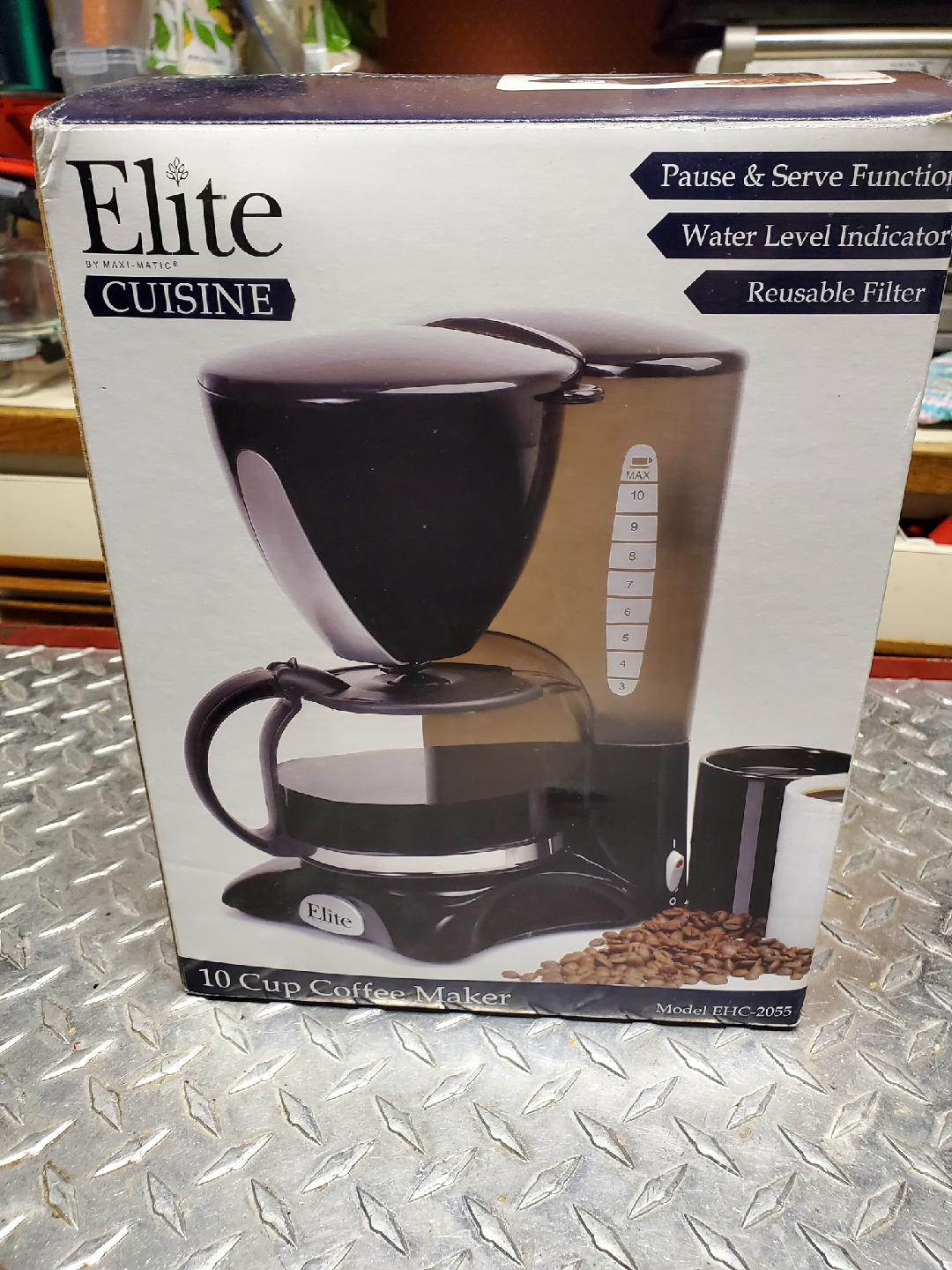 Selling an Elite Cuisine 10 Cup Coffee Maker! It features a pause and serve function, a water level indicator, and a reusable filter. Model number is EHC-2055