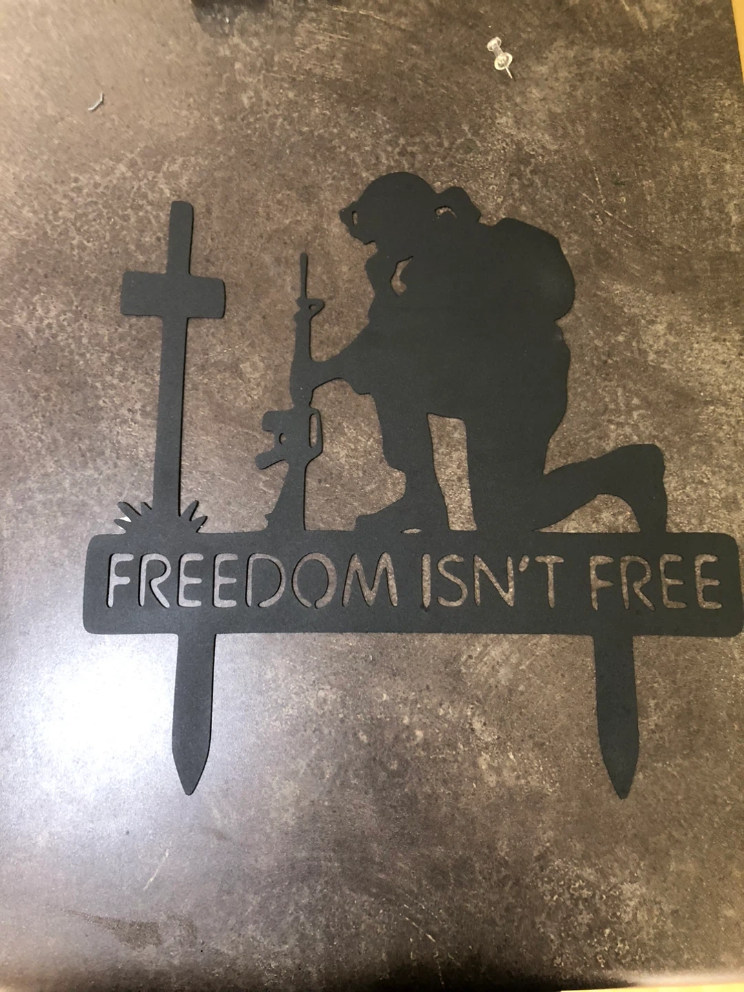 Metal silhouette art piece depicting a kneeling soldier, a cross, and the phrase "Freedom Isn't Free". Perfect for adding a patriotic touch to your garden or home decor