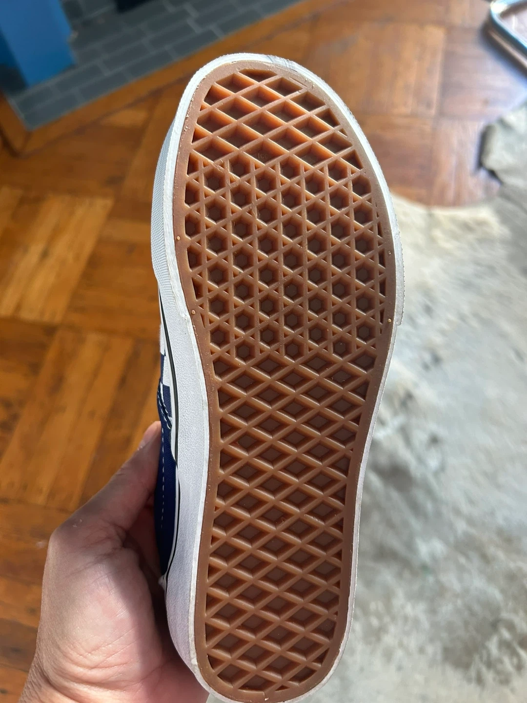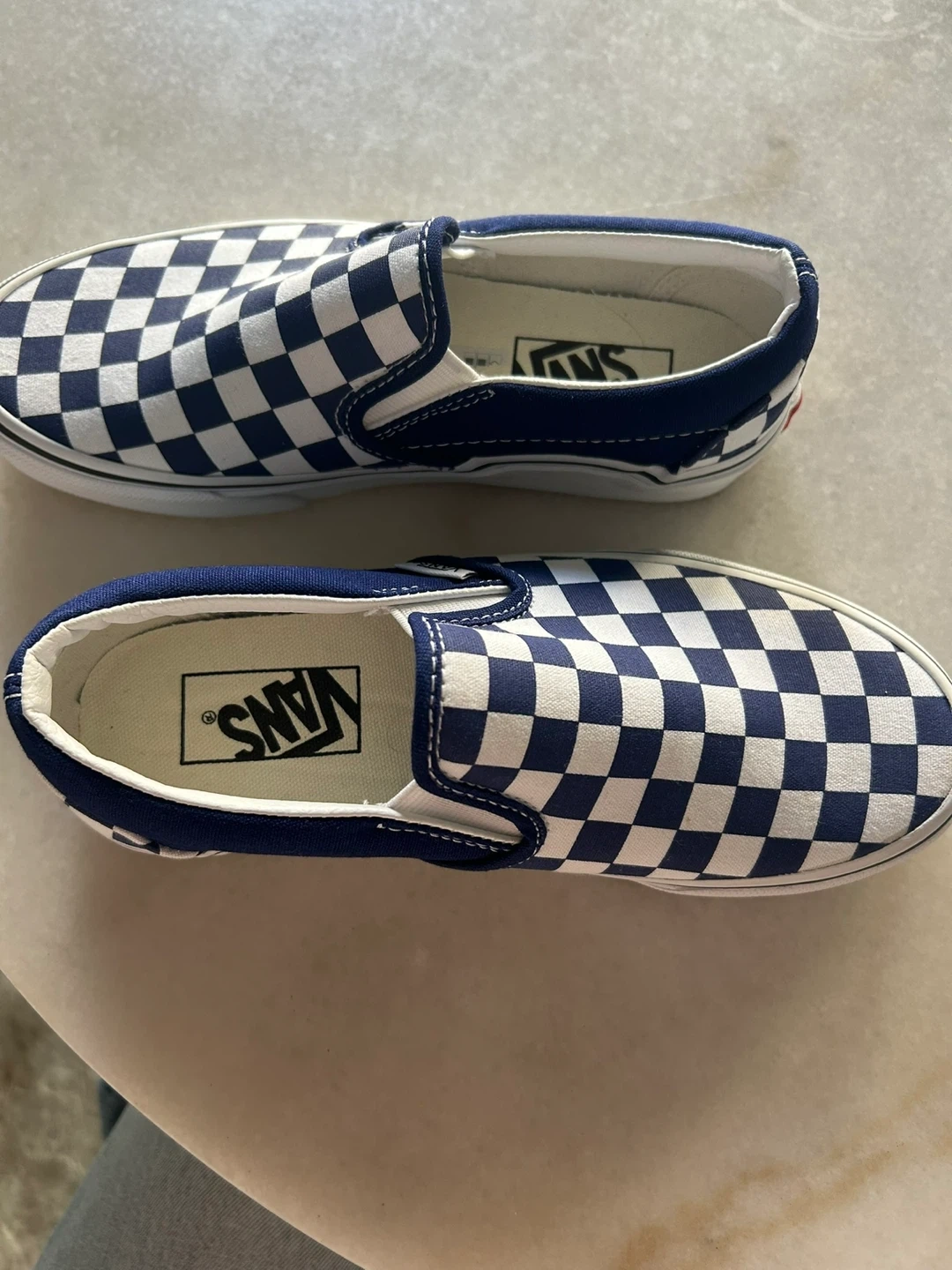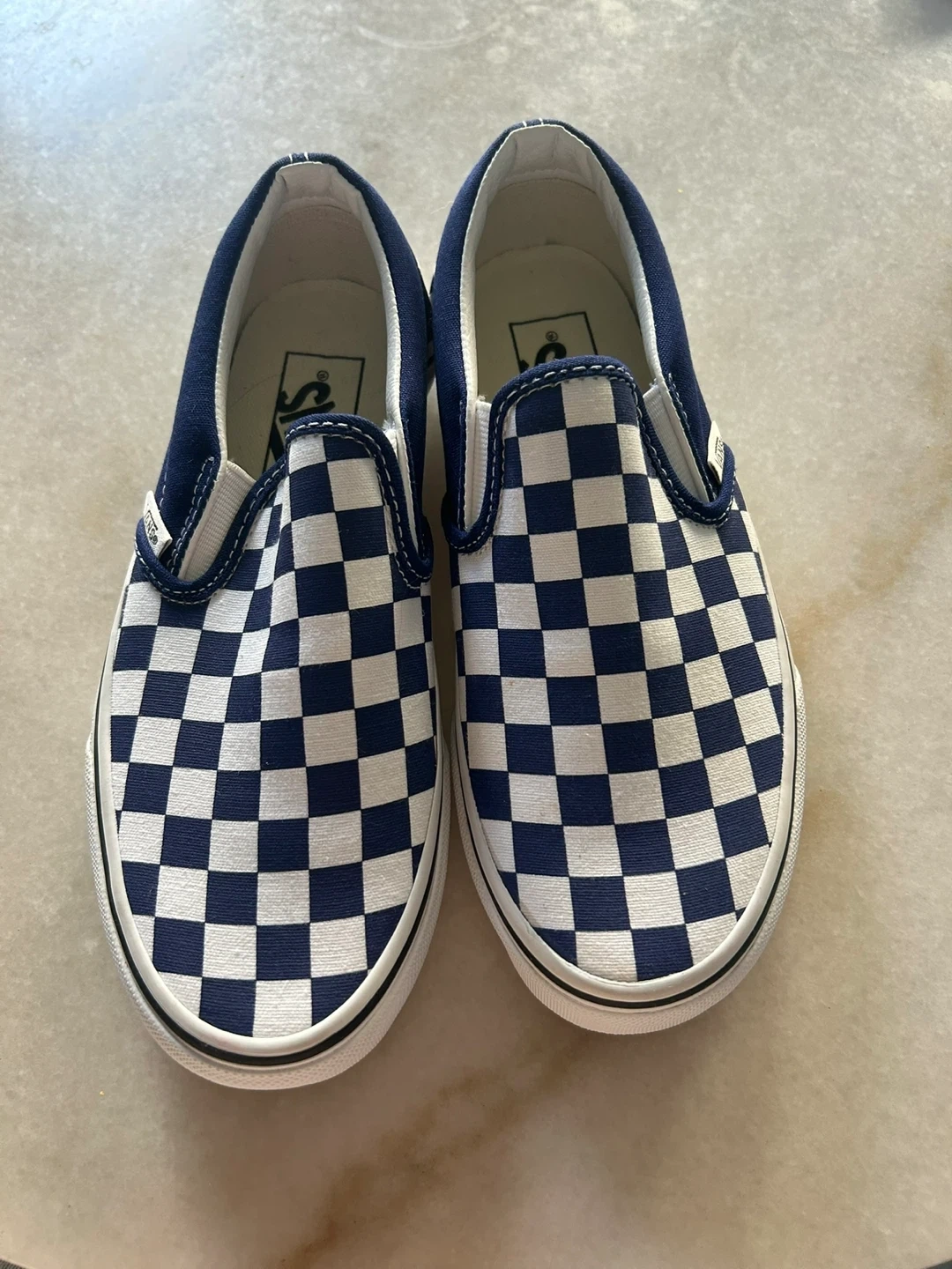 Selling a pair of Vans Kids Classic Slip-On sneakers in a cool blue and white checkered pattern! They're in great shape and ready for a new owner. These are easy to slip on and off, making them perfect for everyday wear