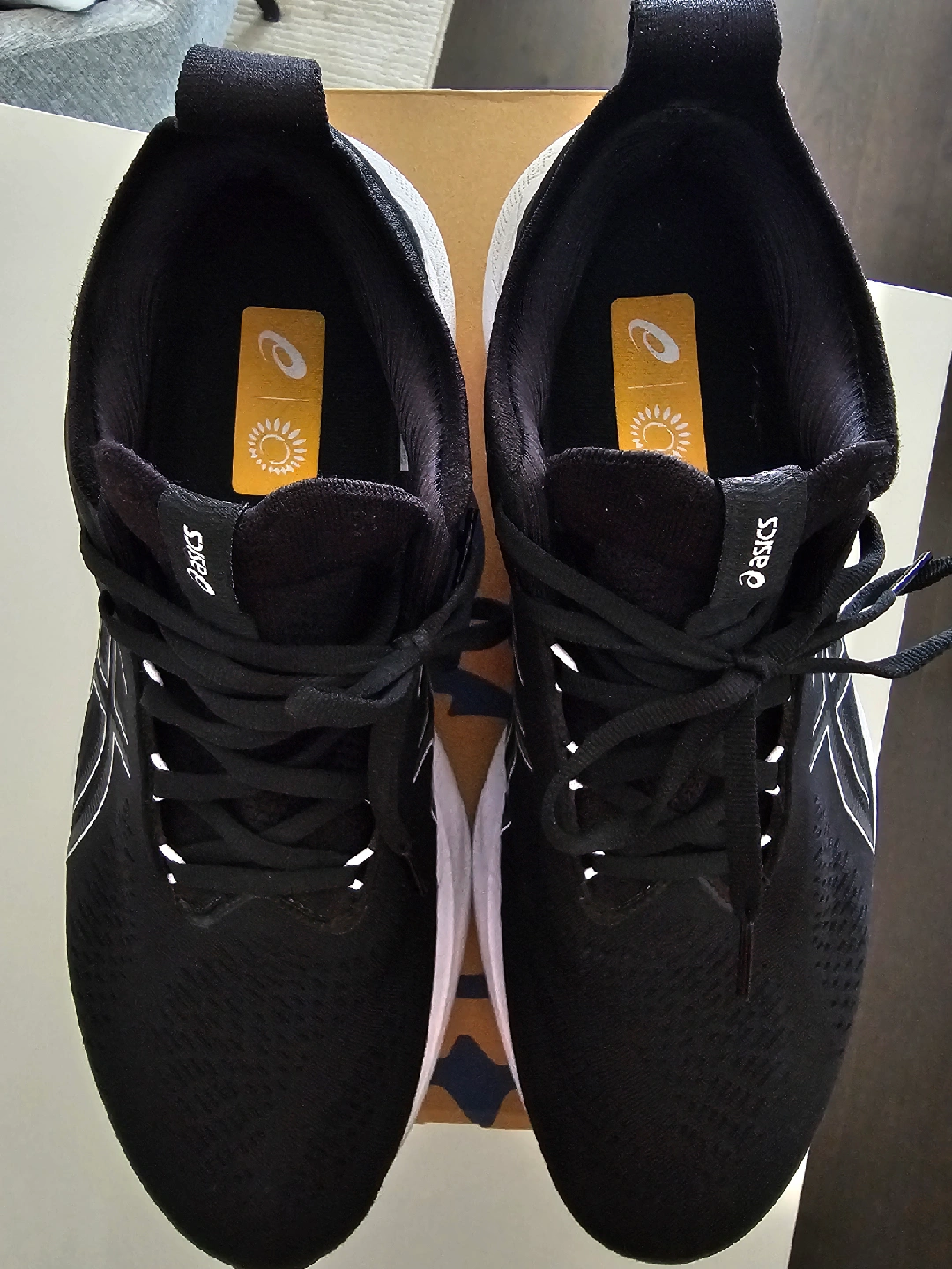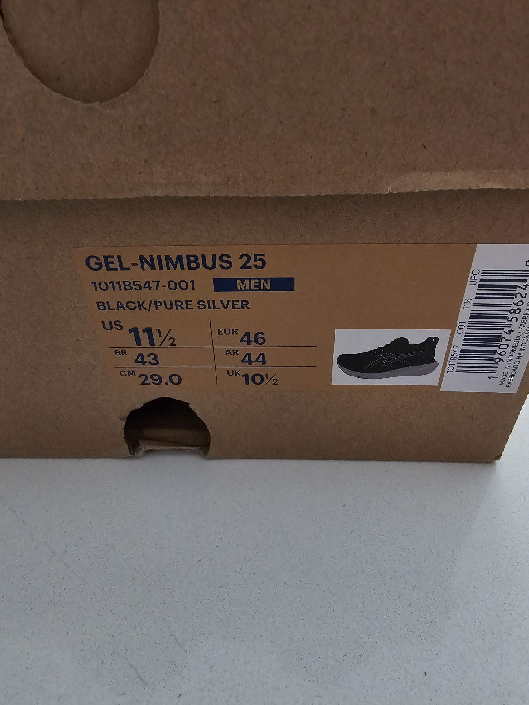 Selling a pair of Asics Gel-Nimbus 25 running shoes in black. They are size US 11.5. The shoes come with the original box. I purchased in June and used them as work shoes over the last 3 months.