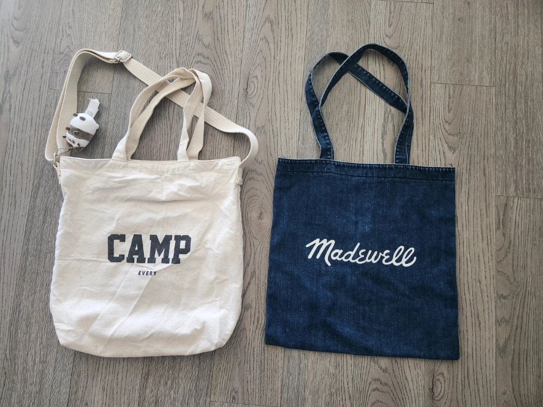 Two cute tote bags for sale! The first is a denim Madewell tote bag and the second is a cream-coloured 'Camp Every' tote bag with a shoulder strap. Both are in great condition and ready for a new home
