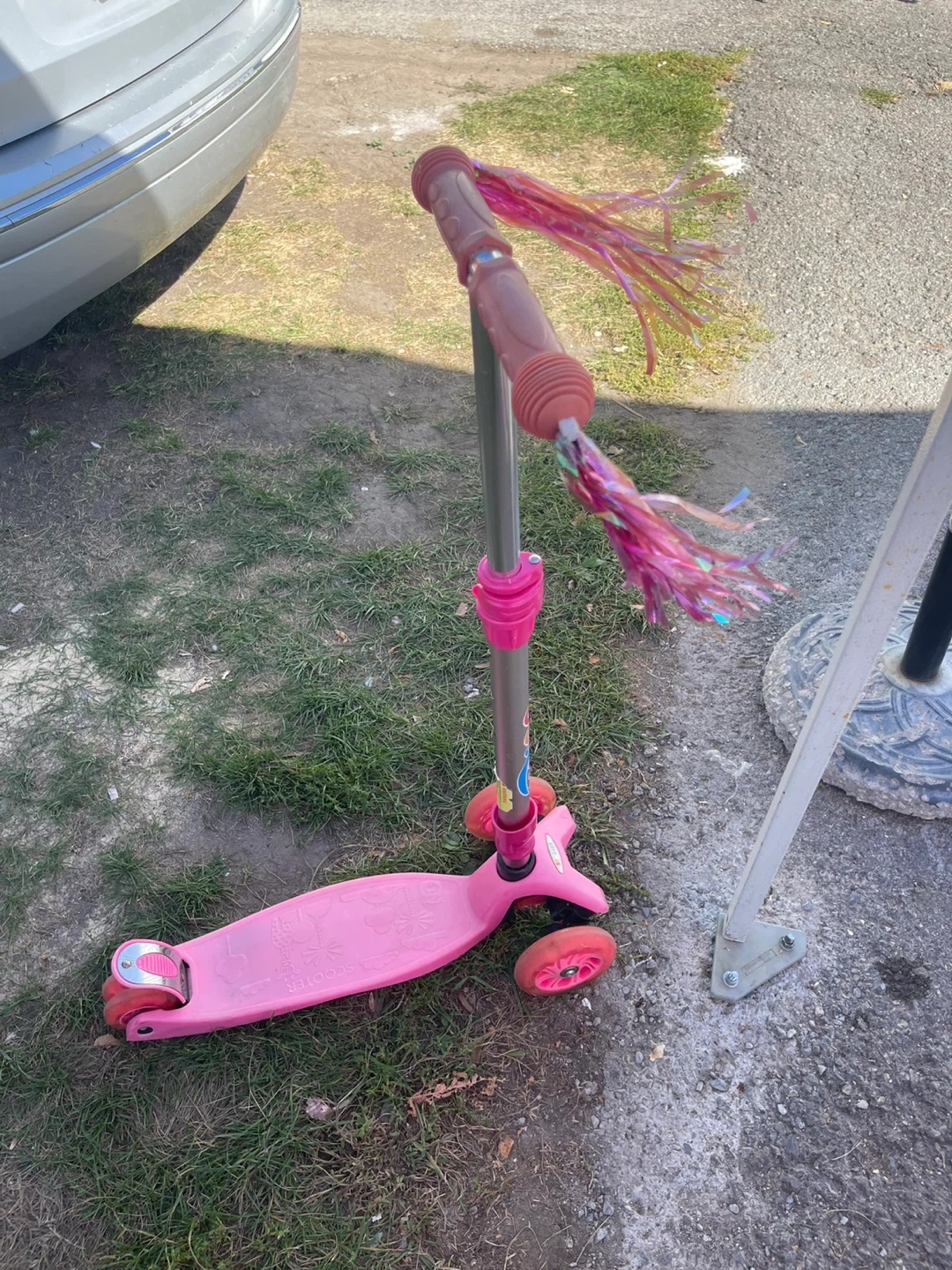 Selling a cute pink scooter for kids! It's got three wheels for extra stability and some fun streamers on the handlebars. Perfect for little ones learning to scoot around the neighbourhood