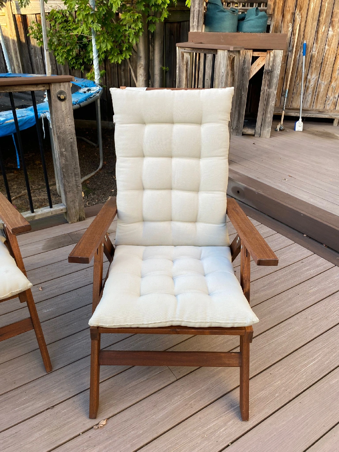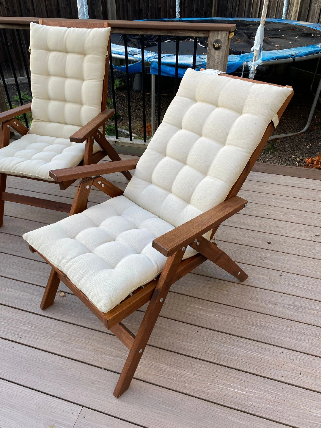 Selling a set of six outdoor folding/reclining chairs. They're in great shape and come with comfy cushions.(except one)