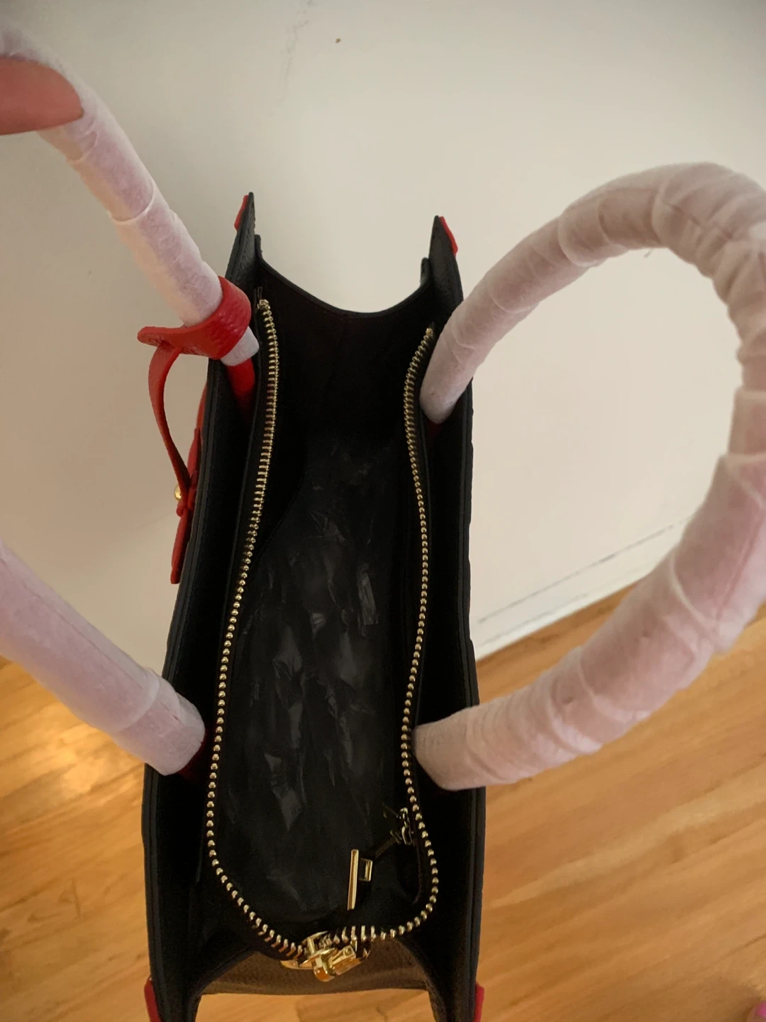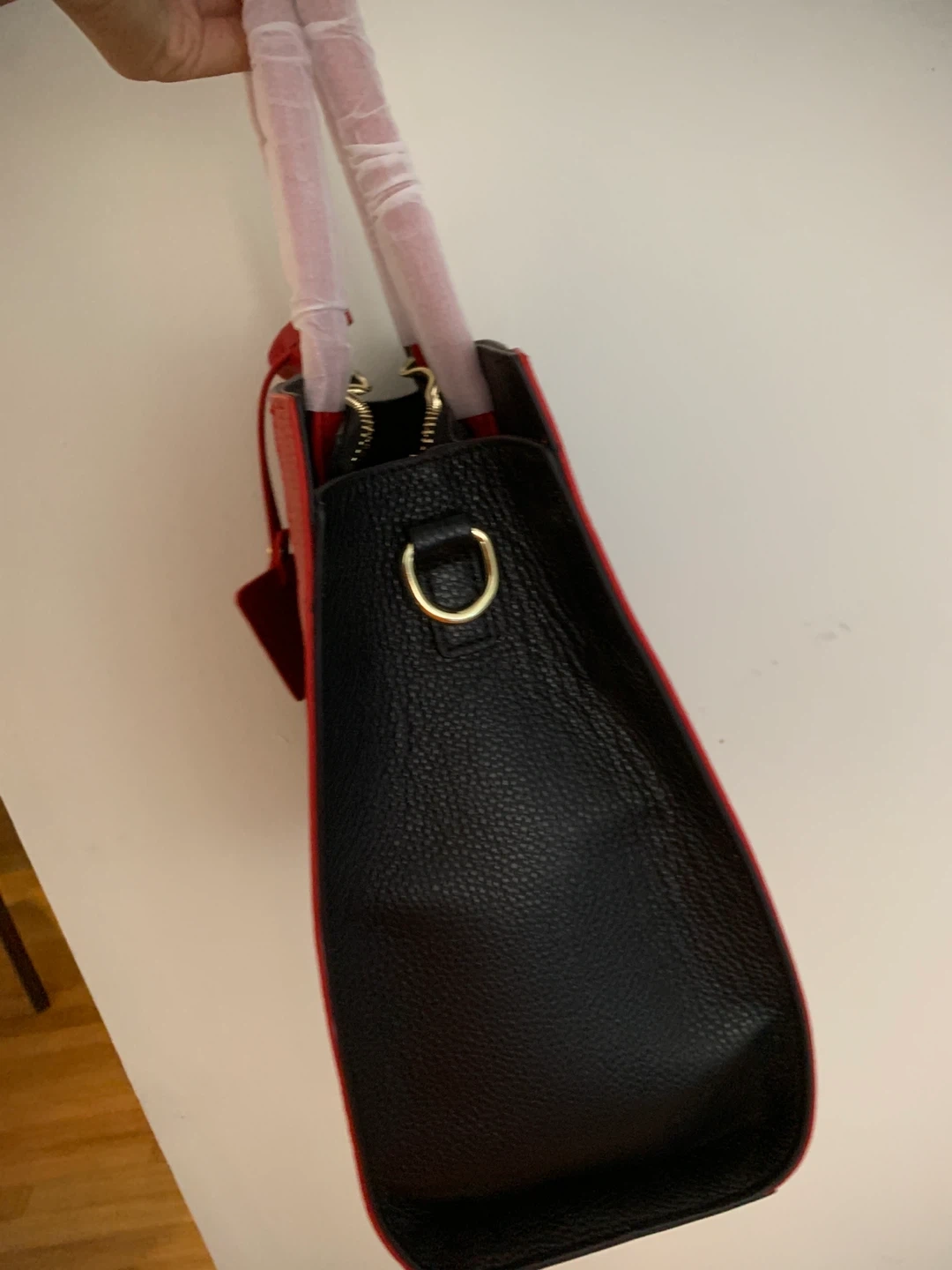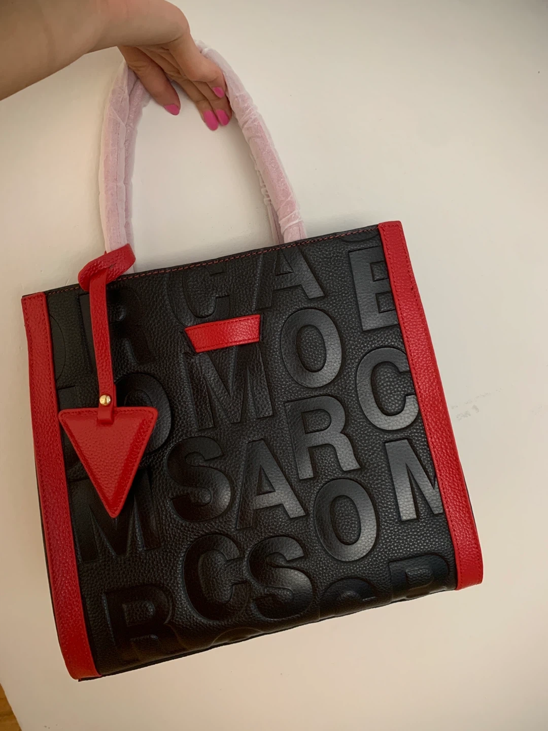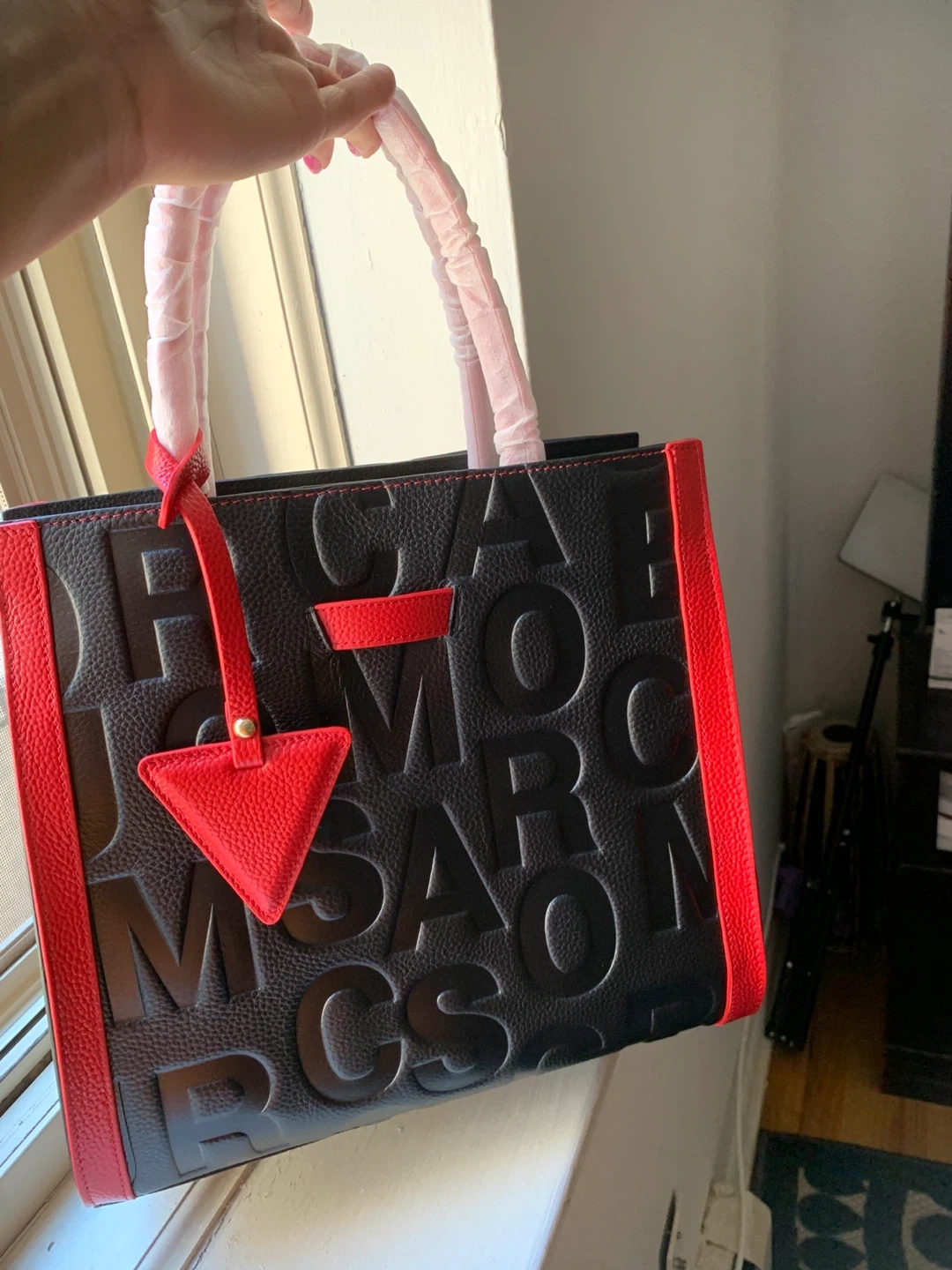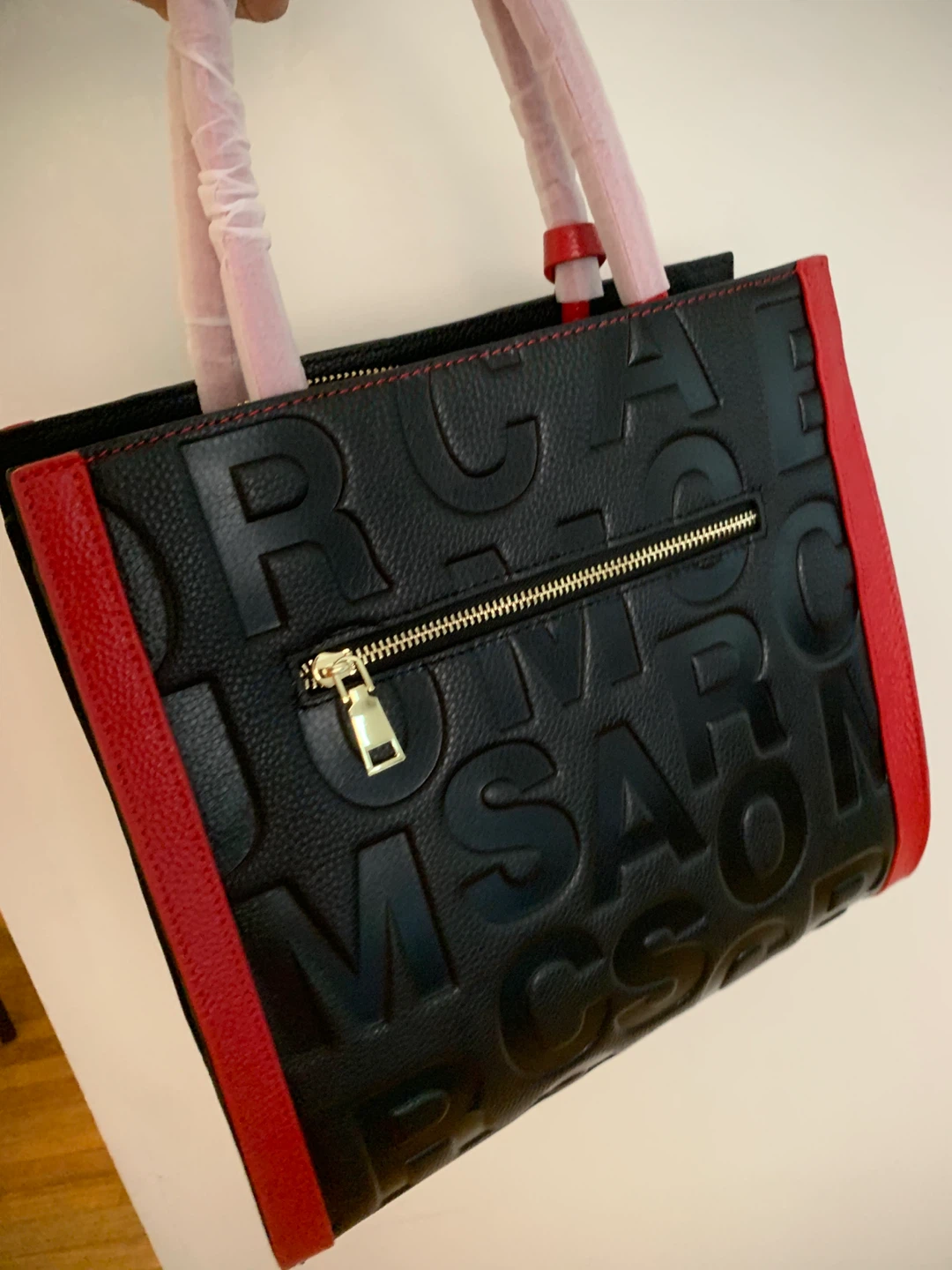 This is a stylish Marc Jacobs tote bag in black leather with red trim. It features embossed lettering and a unique design. The handles are still wrapped, and the interior is lined with a zipper pocket for your essentials. Perfect for everyday use!