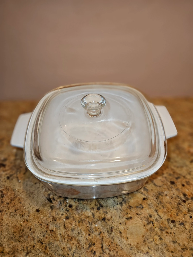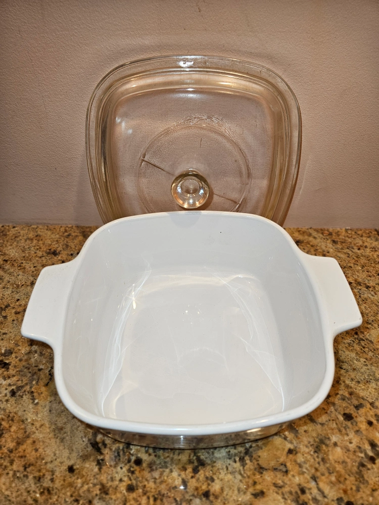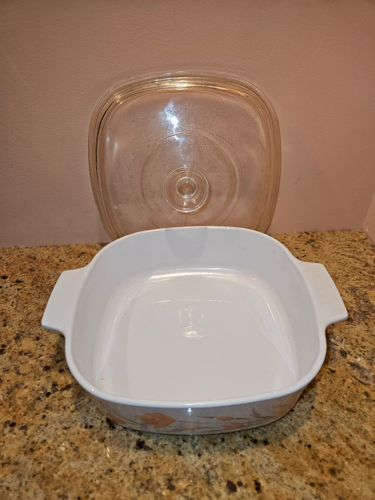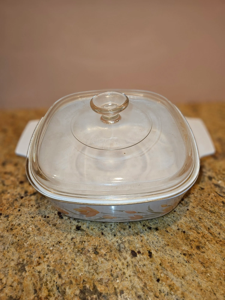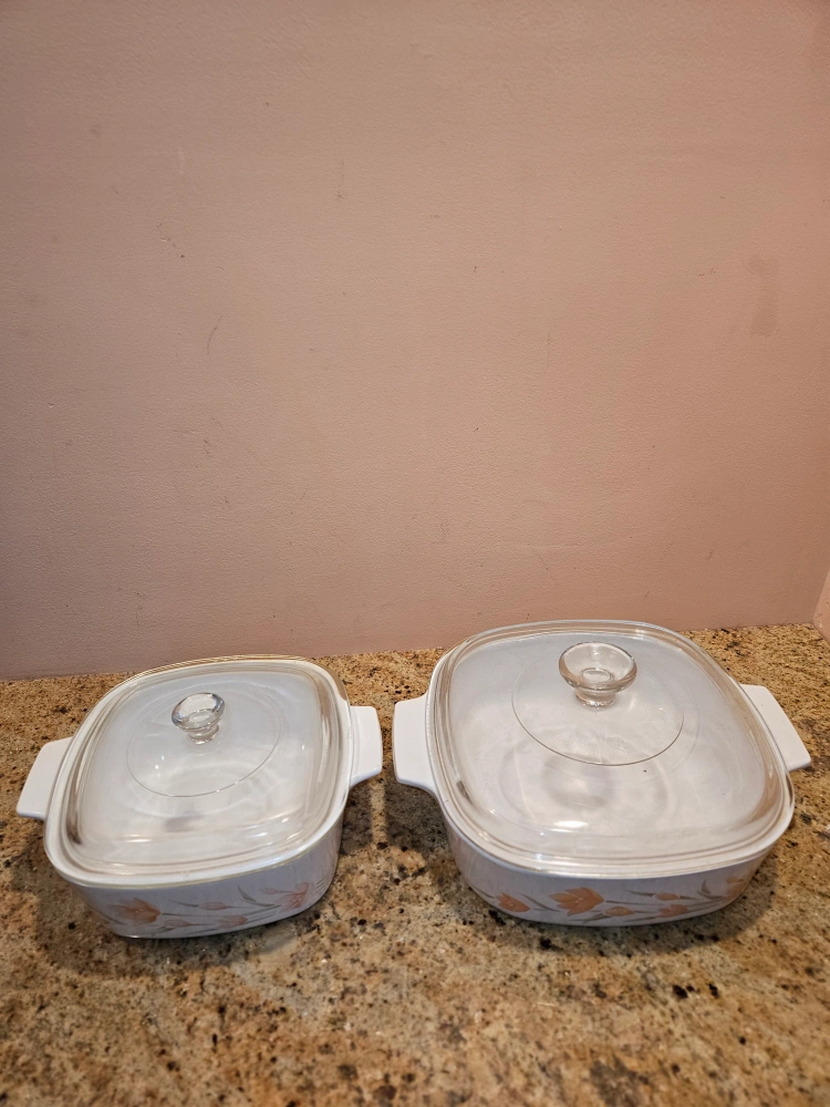 Selling two vintage Corning Ware casserole dishes. They both come with their original glass lids. The larger one has a floral design around the base.