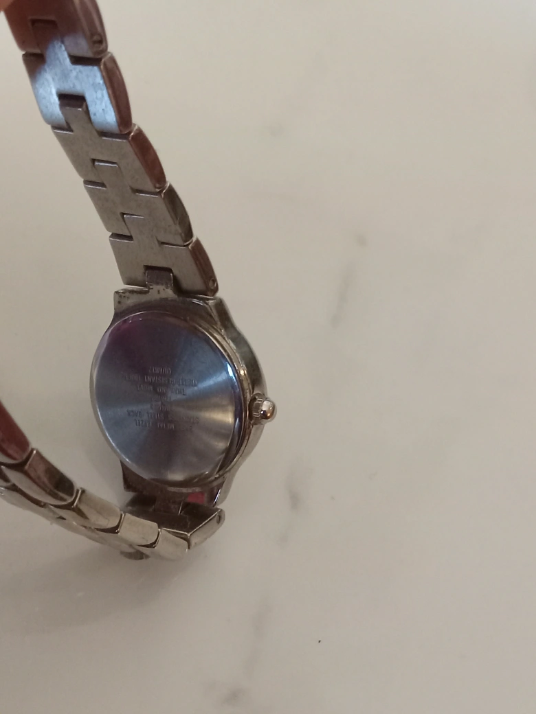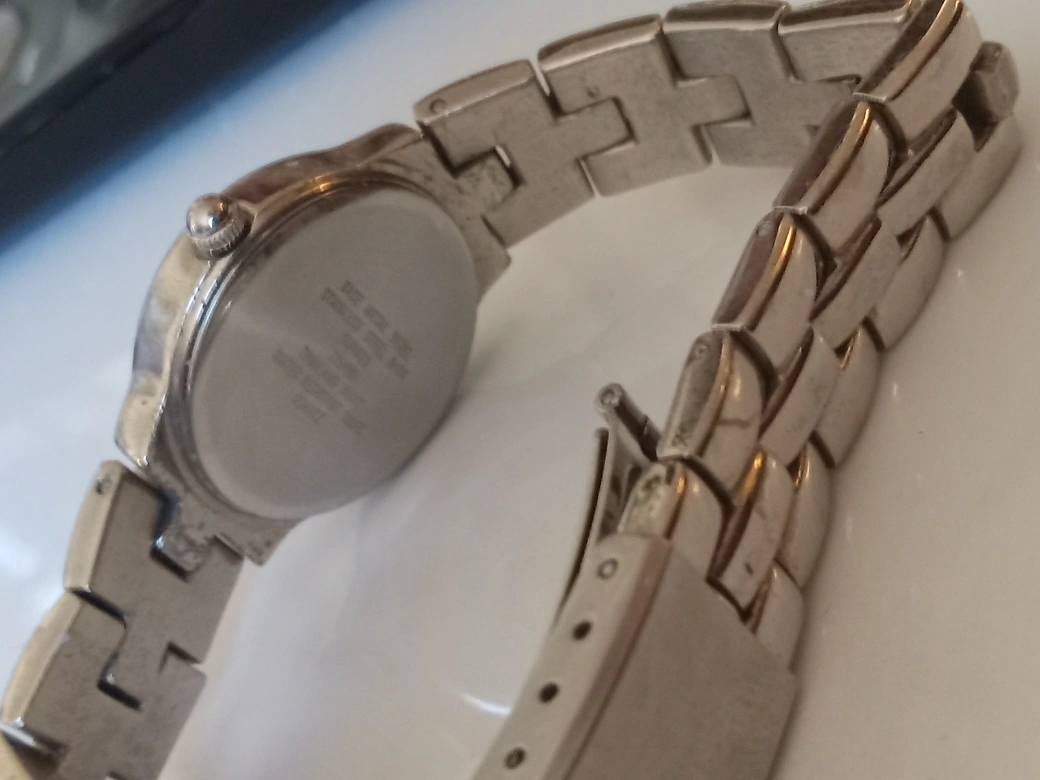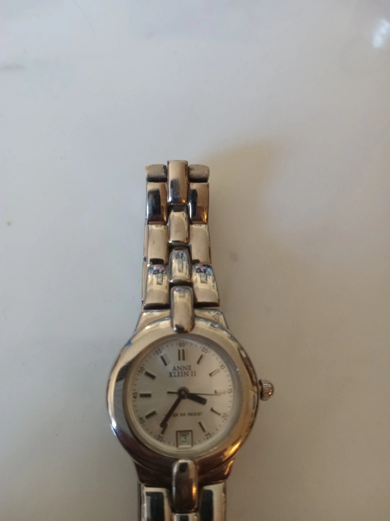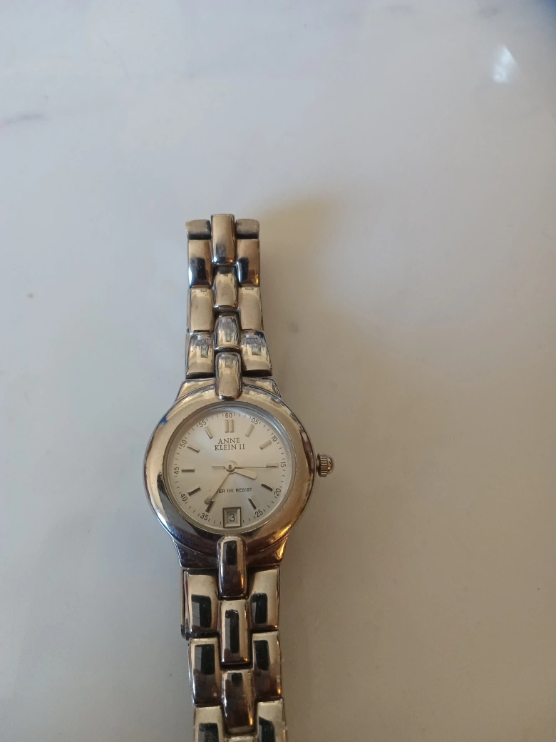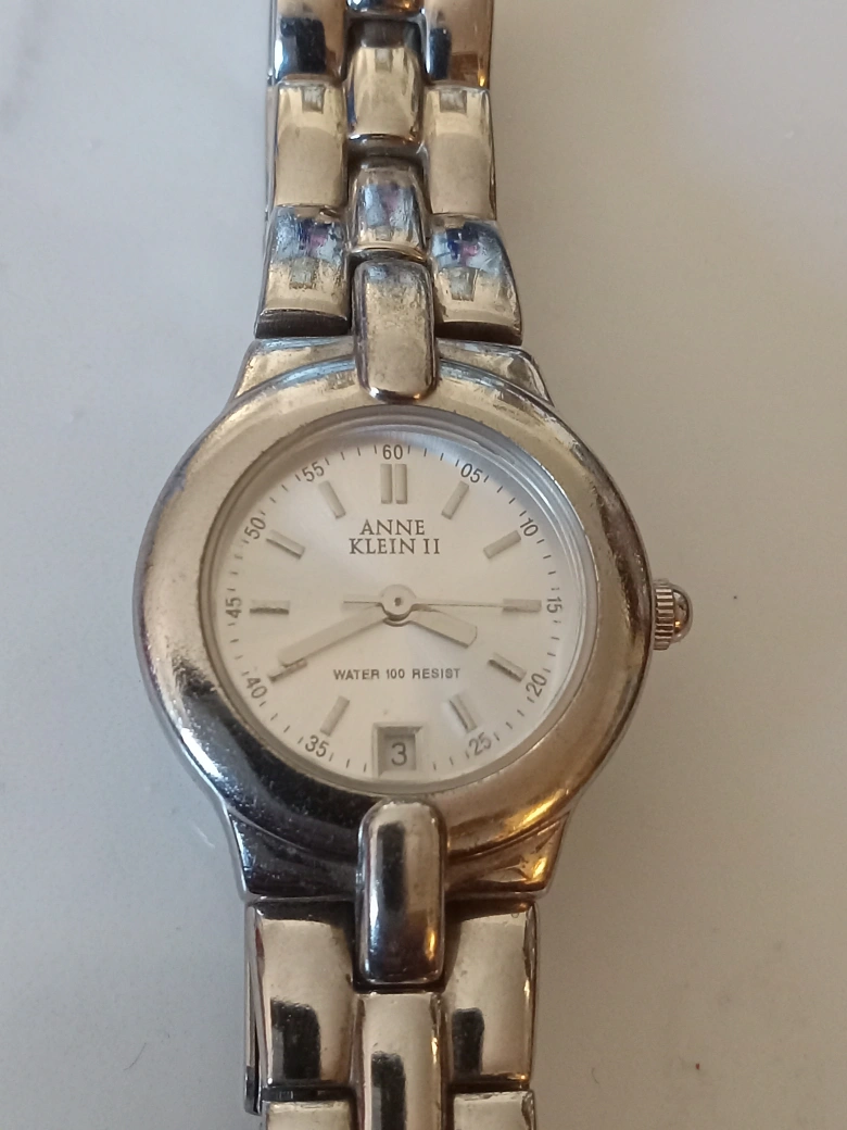 Selling a pre-owned Anne Klein II ladies watch in silver tone. It has a date display and is water resistant to 100 feet. There are some signs of wear.