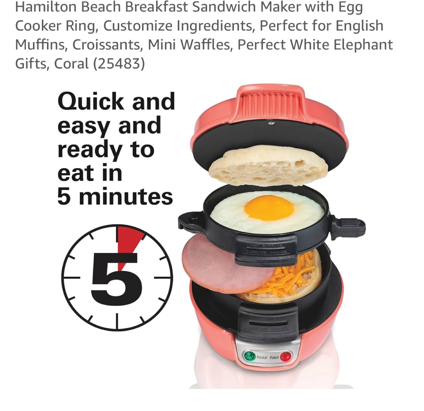 Get ready to enjoy a quick and easy breakfast with this Hamilton Beach Breakfast Sandwich Maker! It's perfect for making English muffins, croissants, and mini waffles. Ready to eat in just 5 minutes. Dimensions are 5.8" x 5.3" x 7.5"