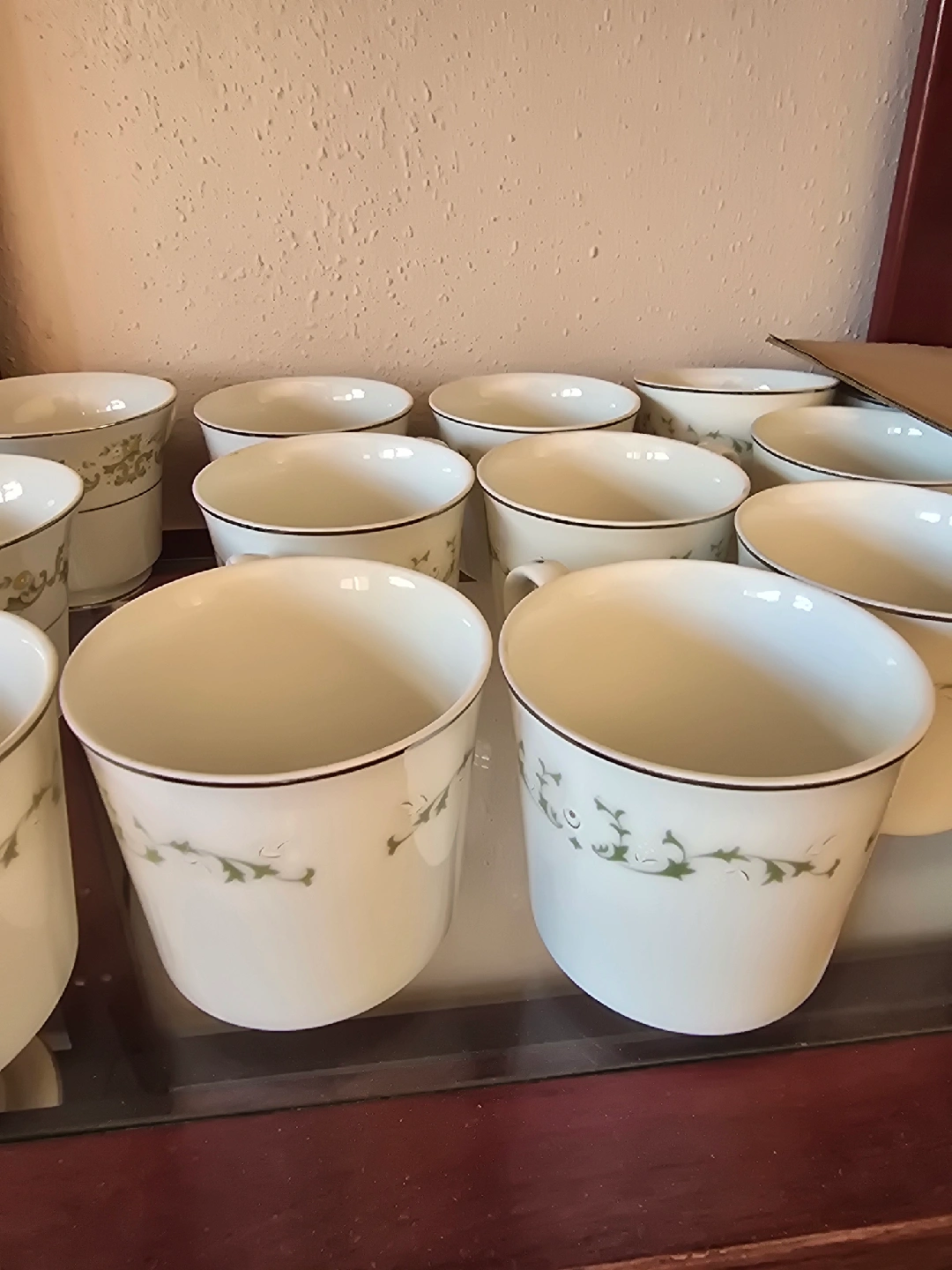 Selling a lovely set of Sheffield Fine China in the Elegance pattern! This set includes cups and saucers with a delicate green floral design. Perfect for adding a touch of elegance to your tea time or dinnerware collection. The model number is 502 T/H.