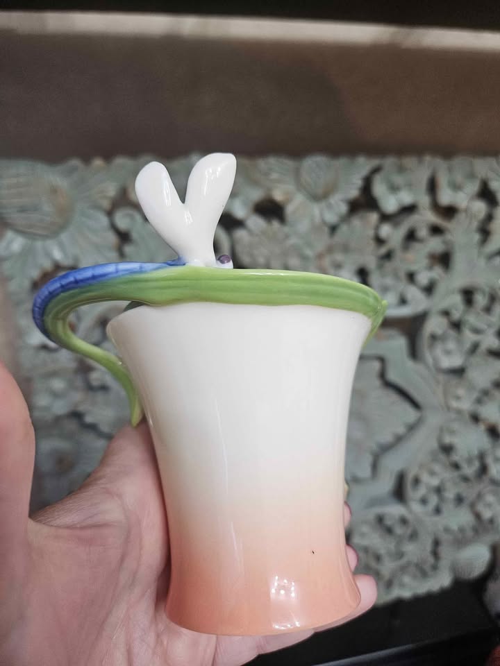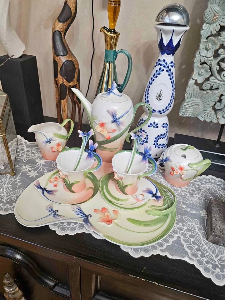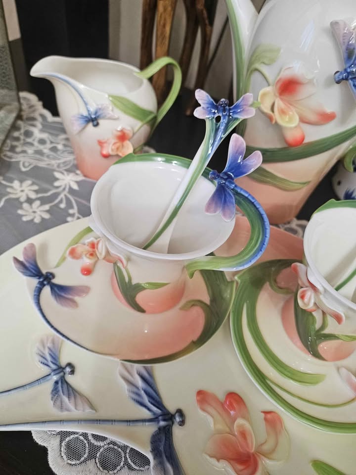It's from the early 2000s and features the cutest dragonflies and delicate orchids. I'm absolutely in love with the ceramic, it's so elegant and the colors are so pretty. This set is perfect for serving tea or coffee. PICK UP at 471 Jevlan drive unit 7 woodbridge. Deposit is required to hold on the item.